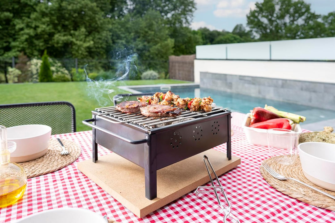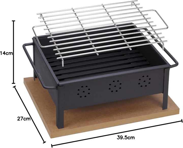 • Einschliesslich unteres verstärktes Gitter für die Holzkohle. Einschliesslich Basis aus Holz, um den Tisch vor der Hitze der Glut zu schützen.