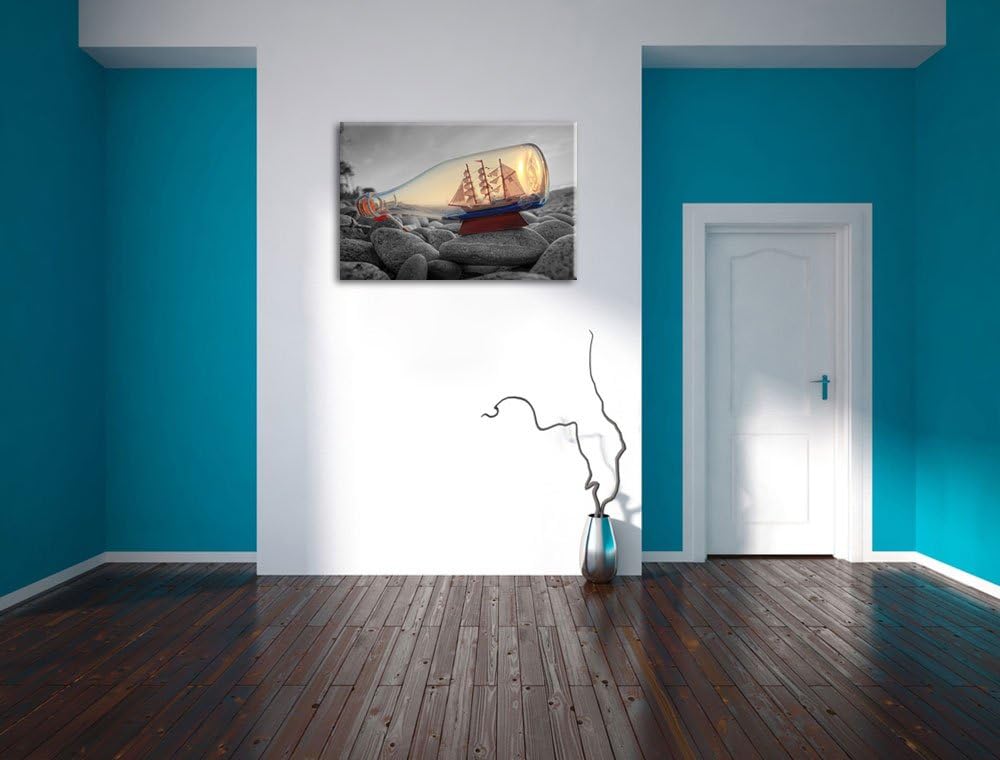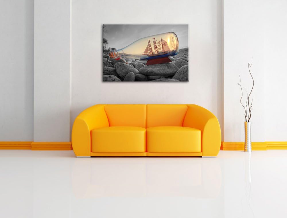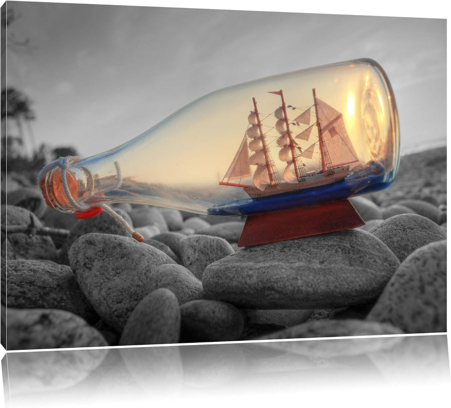 Schiff in Flasche am Steinstrand schwarz/weiss Format: 100x70 auf Leinwand, XXL riesige Bilder ferti