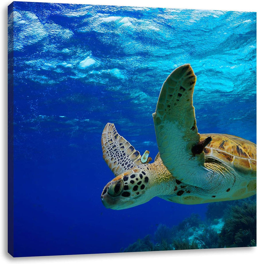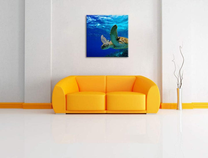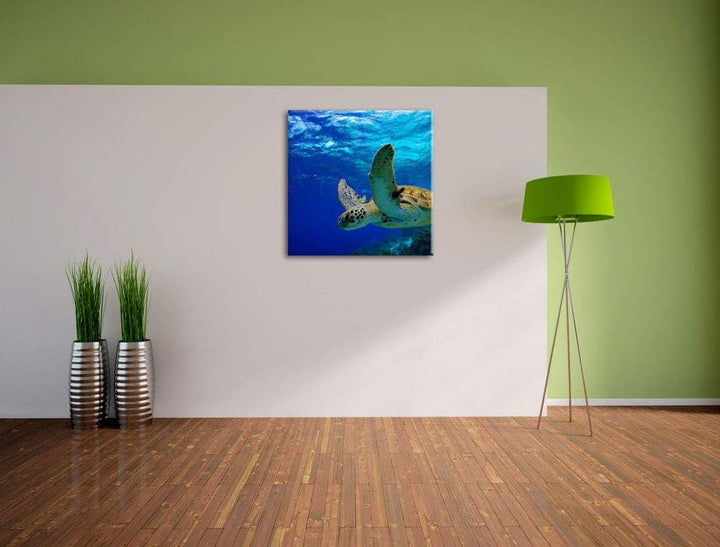 Schildkröte im Riff, Format: 70x70 auf Leinwand, XXL riesige Bilder fertig gerahmt mit Keilrahmen, K