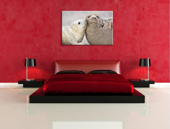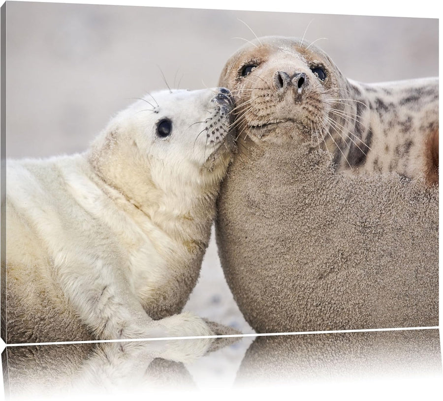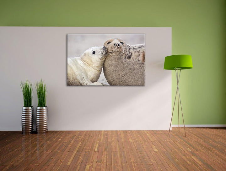Schmusende Robben Format: 100x70 auf Leinwand, XXL riesige Bilder fertig gerahmt mit Keilrahmen, Kun