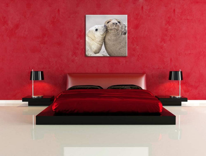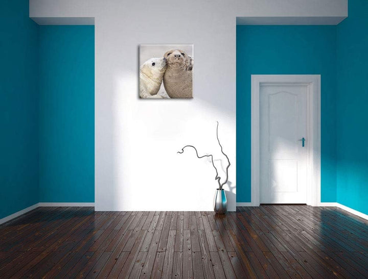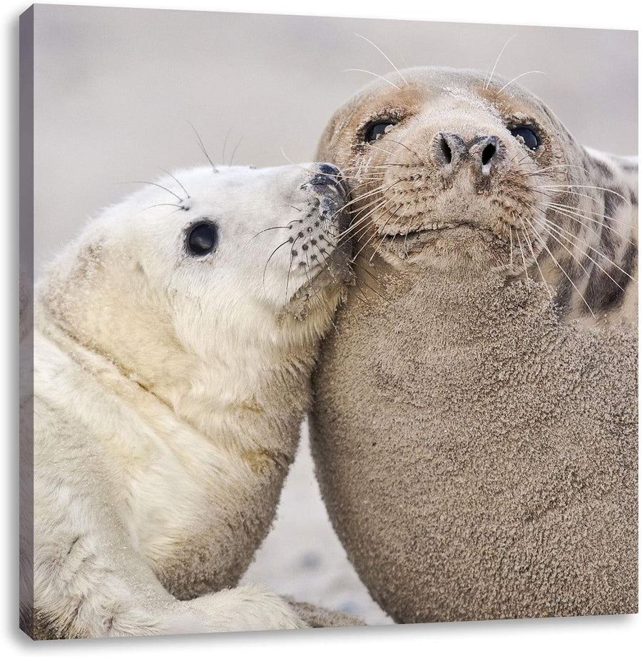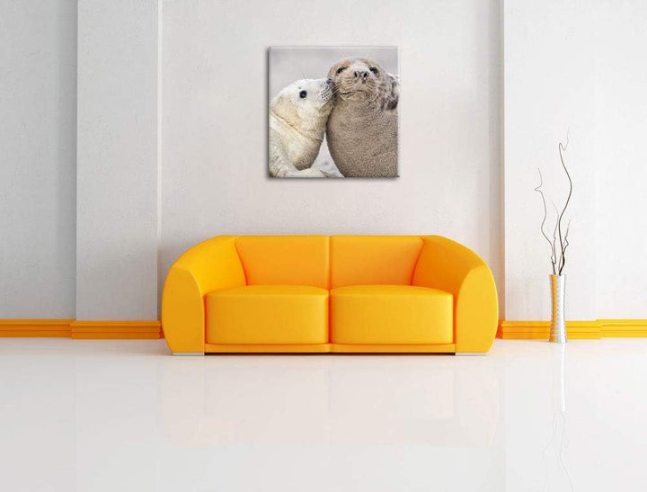Schmusende Robben, Format: 70x70 auf Leinwand, XXL riesige Bilder fertig gerahmt mit Keilrahmen, Kun