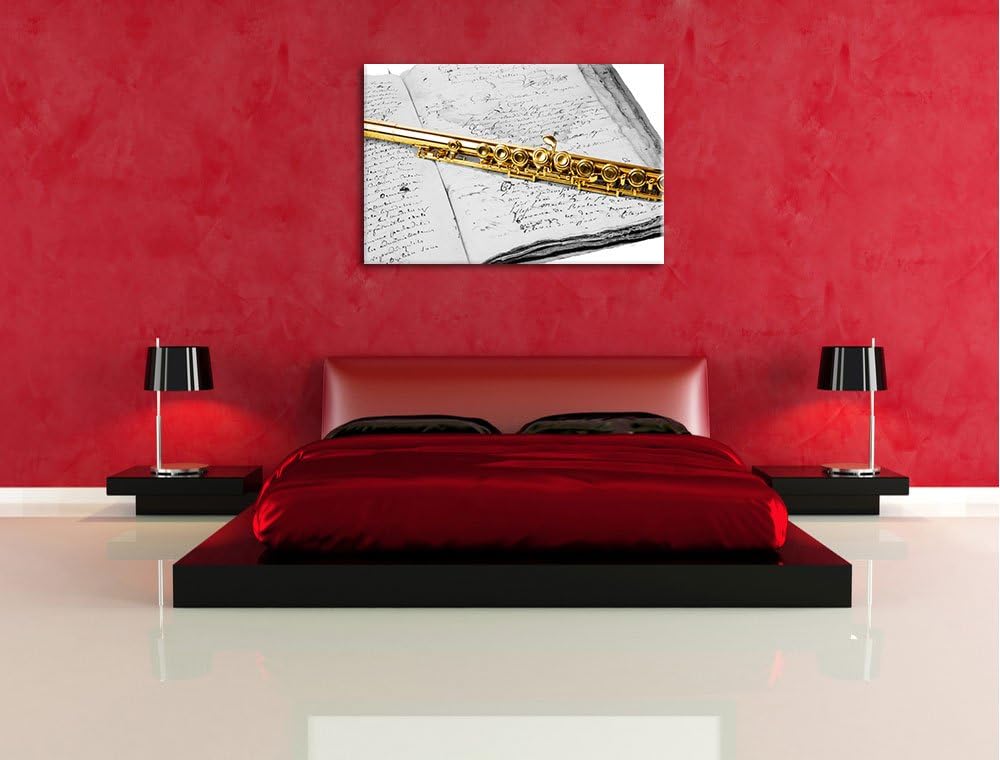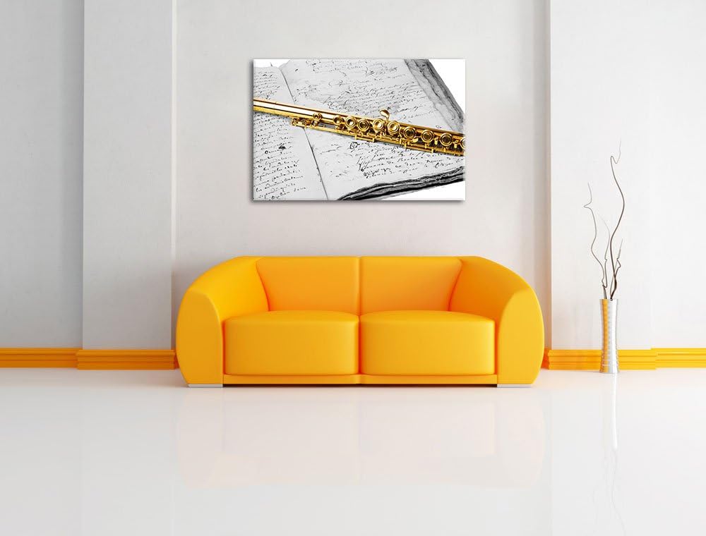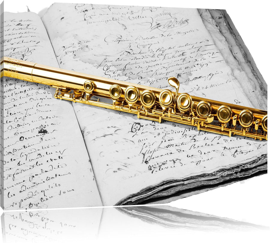 schöne Querflöte auf altem Buch schwarz/weiss Format: 100x70 auf Leinwand, XXL riesige Bilder fertig