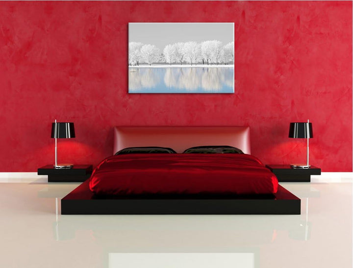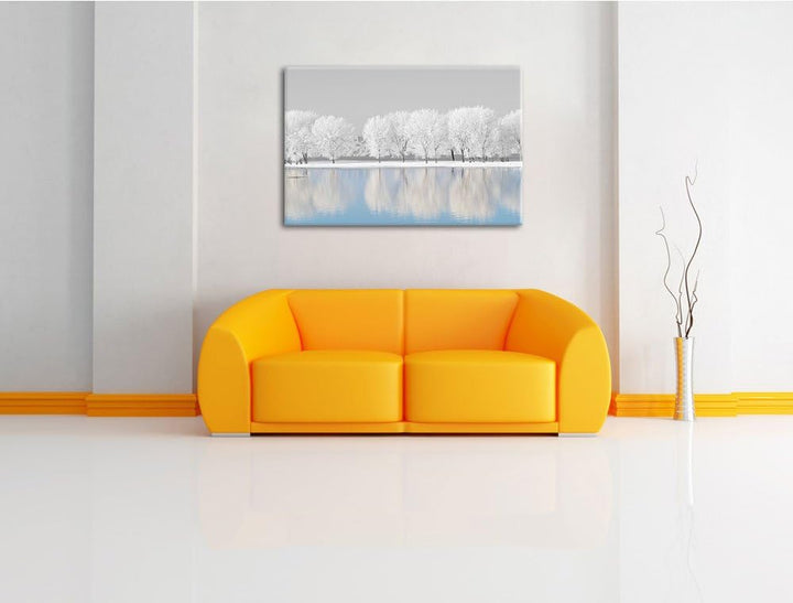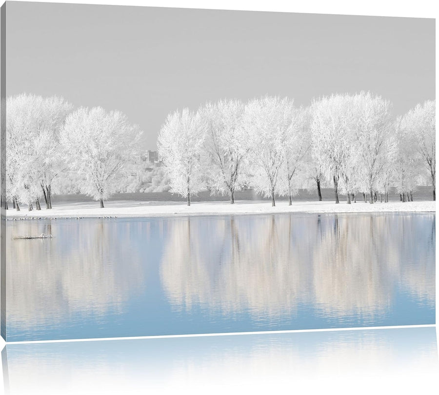 schneebedeckte Bäume an einem See schwarz/weiss Format: 100x70 auf Leinwand, XXL riesige Bilder fert