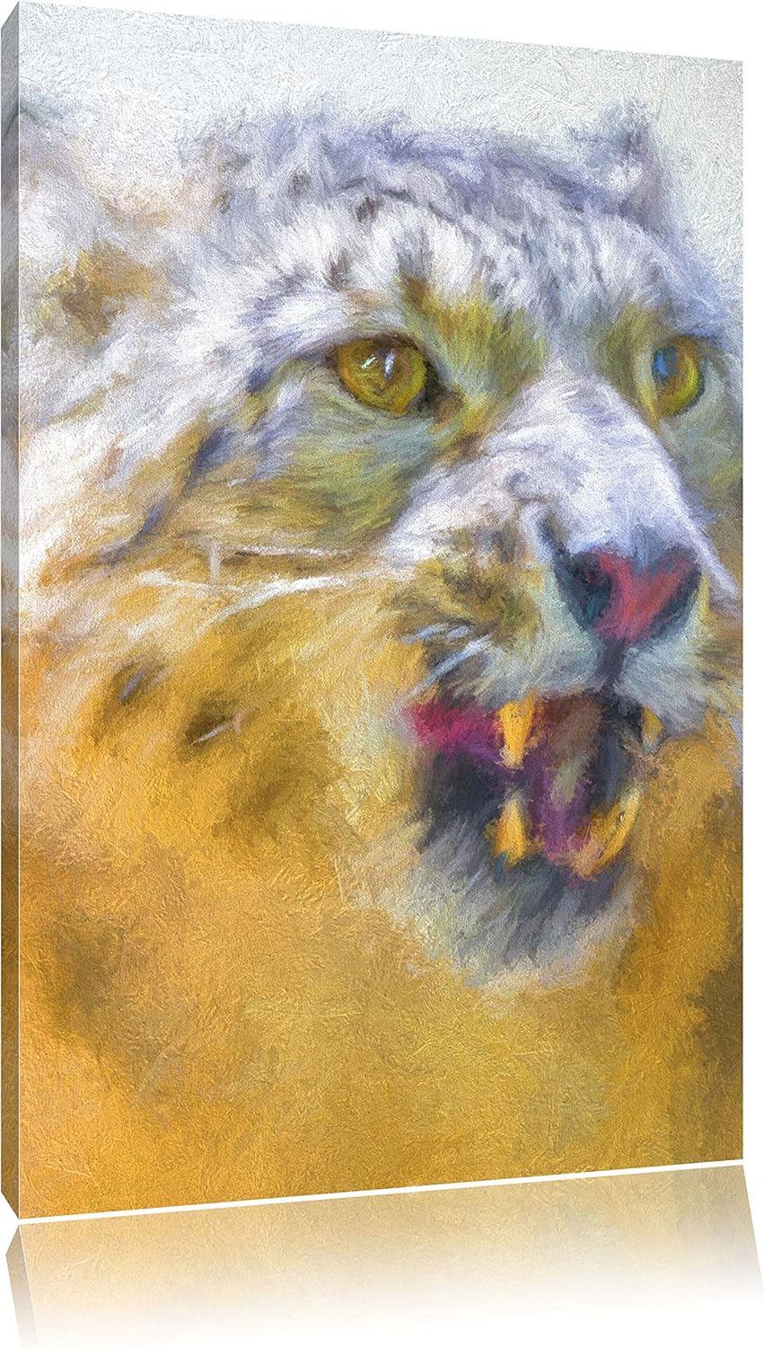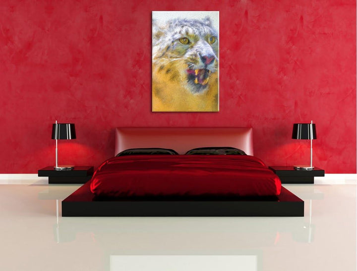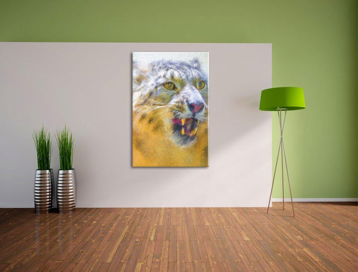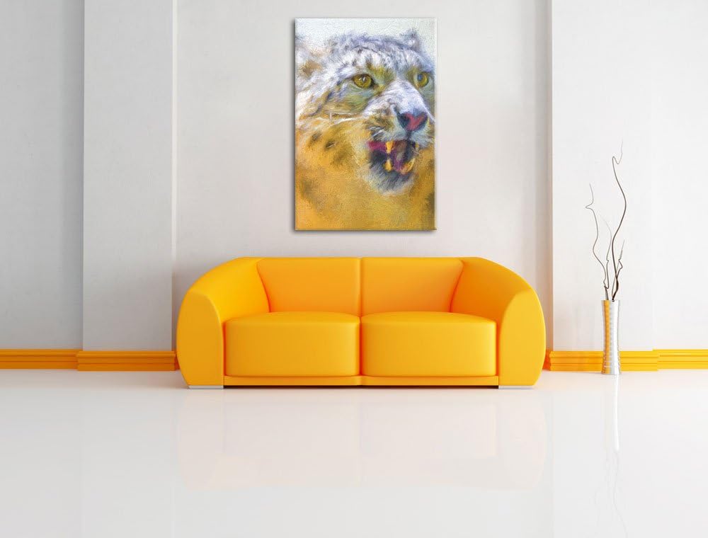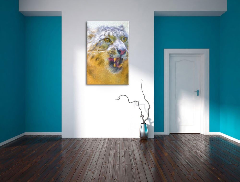 Schneeleopard zeigt Zähne Deluxe Format: 100x70 cm auf Leinwand, XXL riesige Bilder fertig gerahmt m