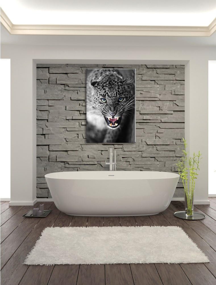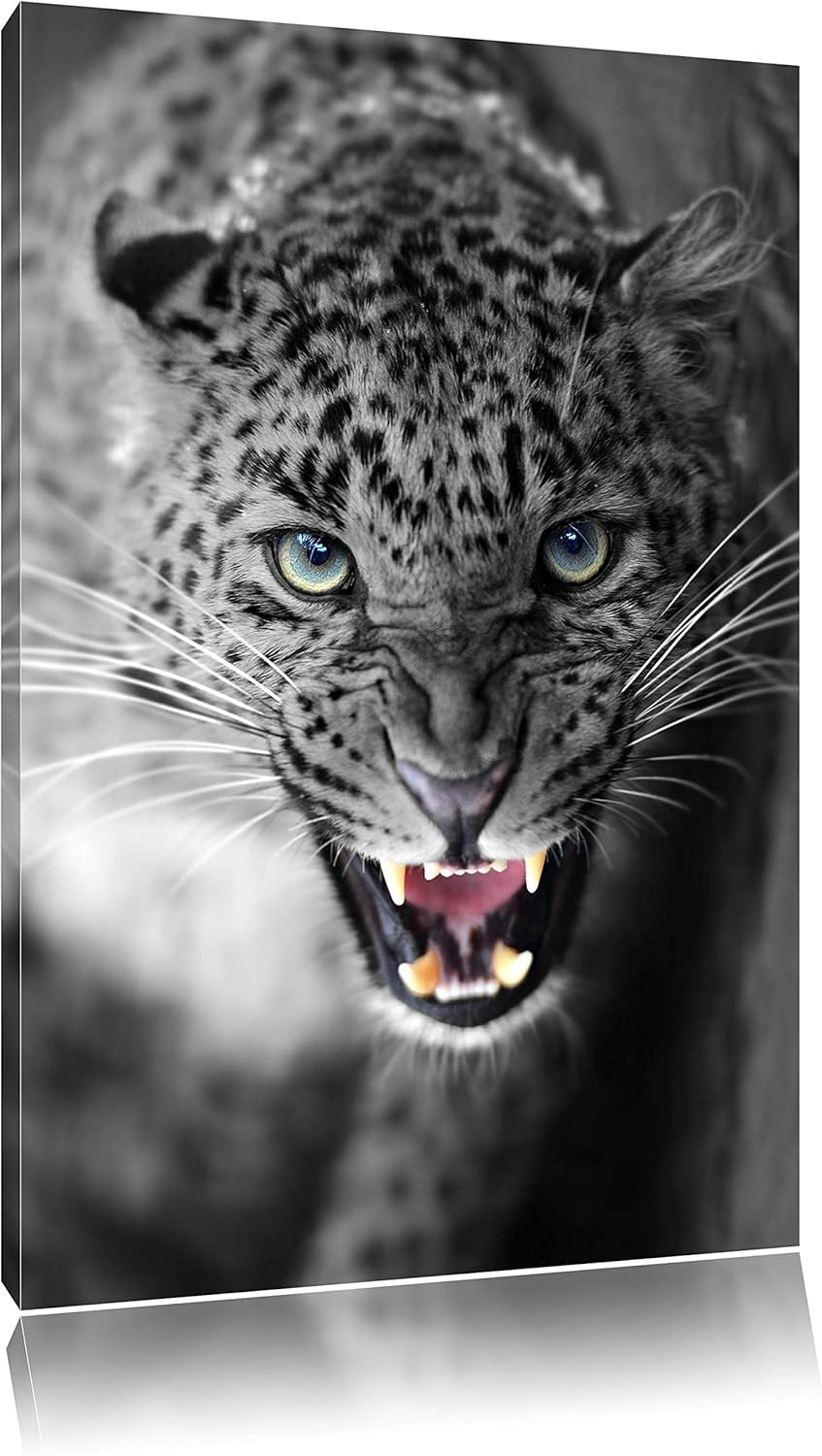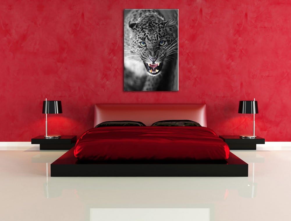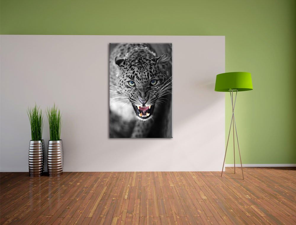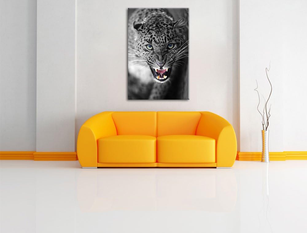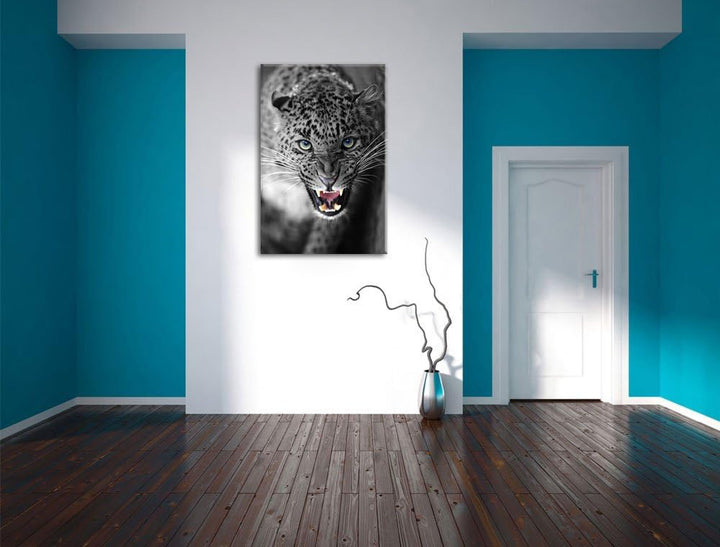 schöner fauchender Leopard schwarz/weiss Format: 100x70 auf Leinwand, XXL riesige Bilder fertig gera