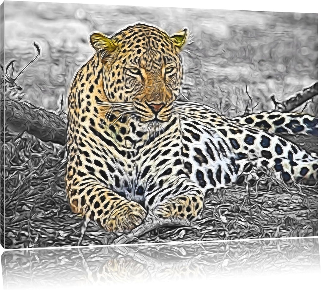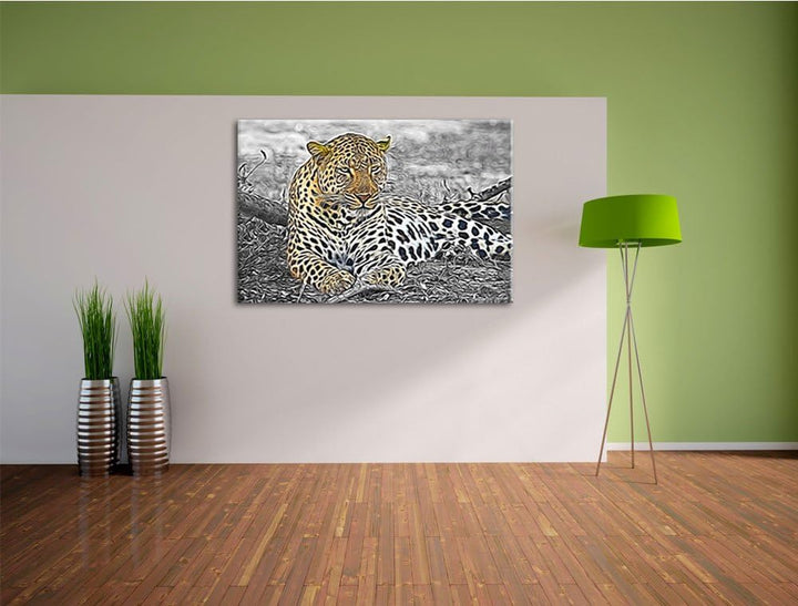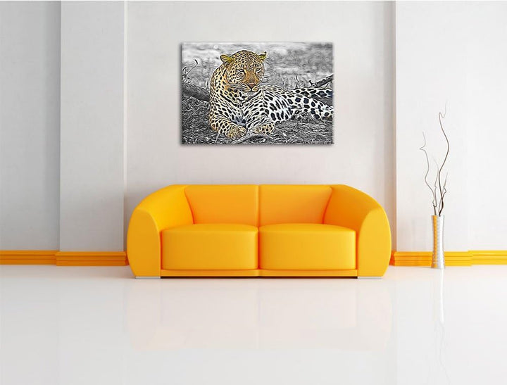 schöner Leopard liegt im Laub schwarz/weiss Deluxe Format: 100x70 cm auf Leinwand, XXL riesige Bilde