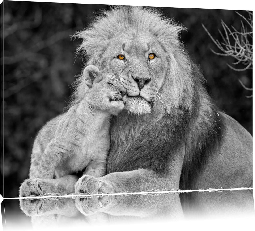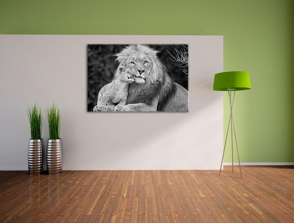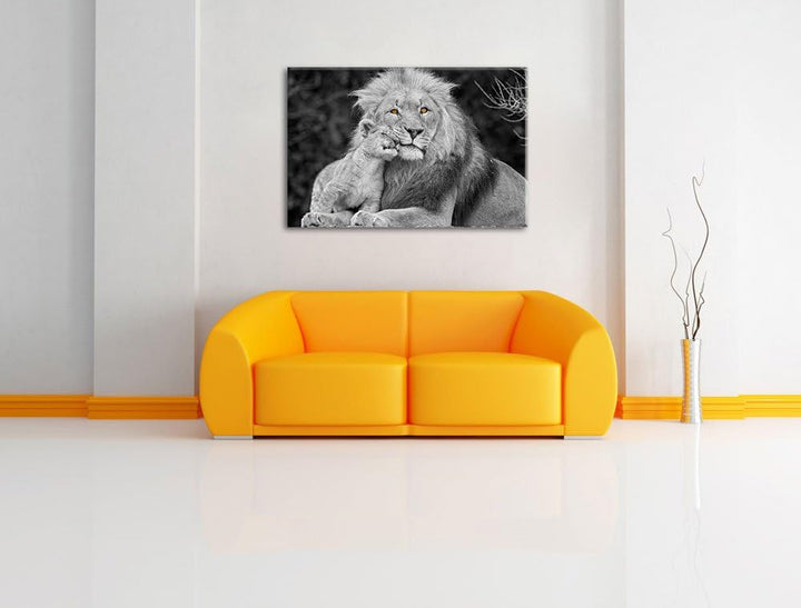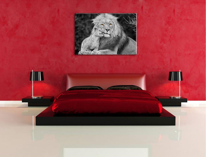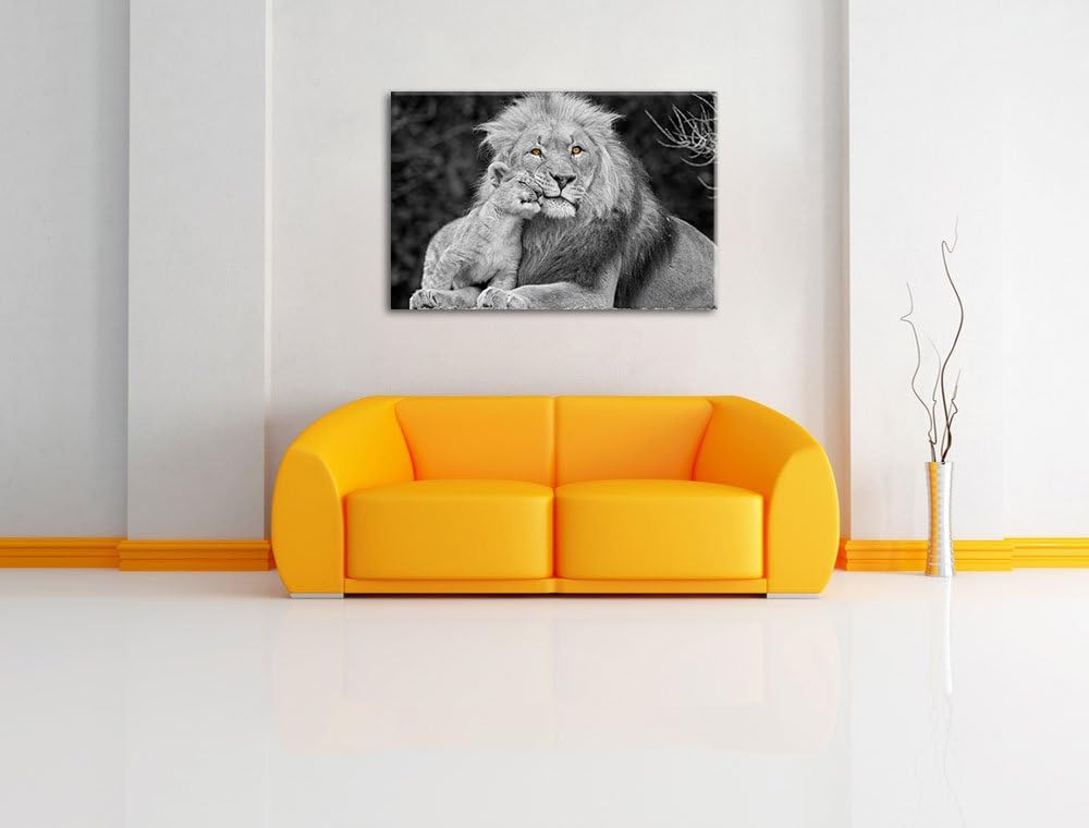 schöner Löwe mit Jungtier schwarz/weiss auf Leinwand, XXL riesige Bilder fertig gerahmt mit Keilrahm