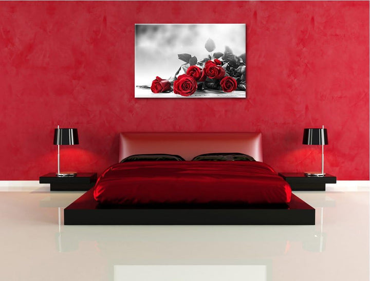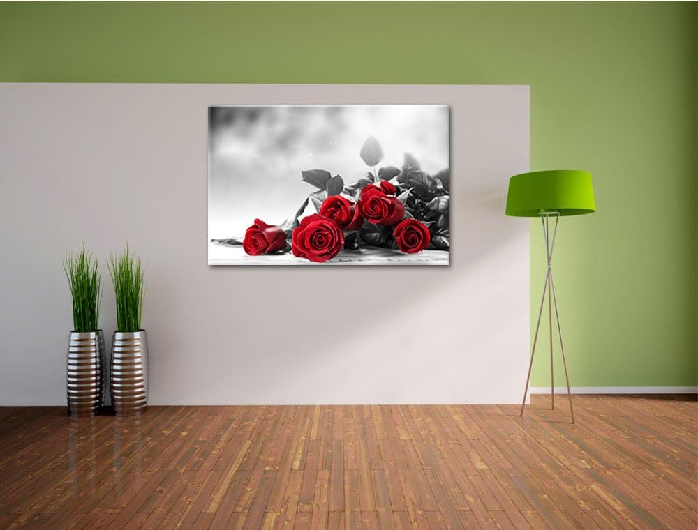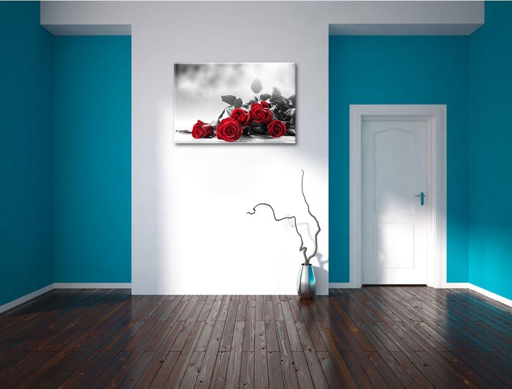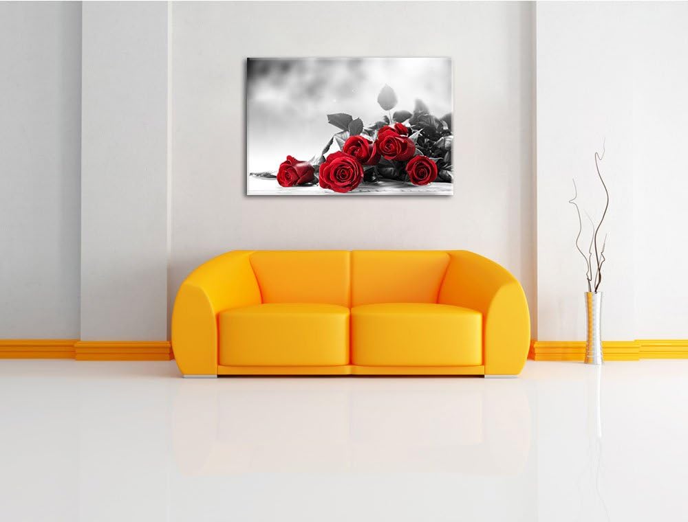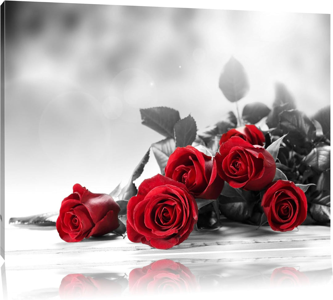 schöner Rosenstrauss auf Tisch schwarz/weiss Format: 100x70 auf Leinwand, XXL riesige Bilder fertig