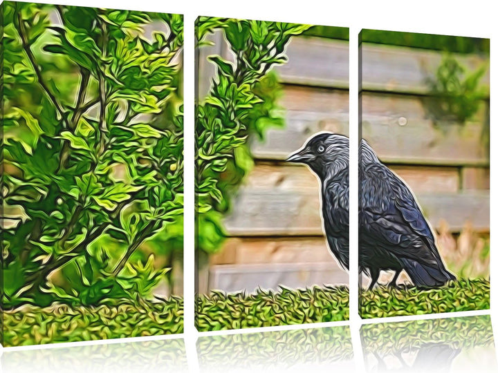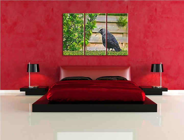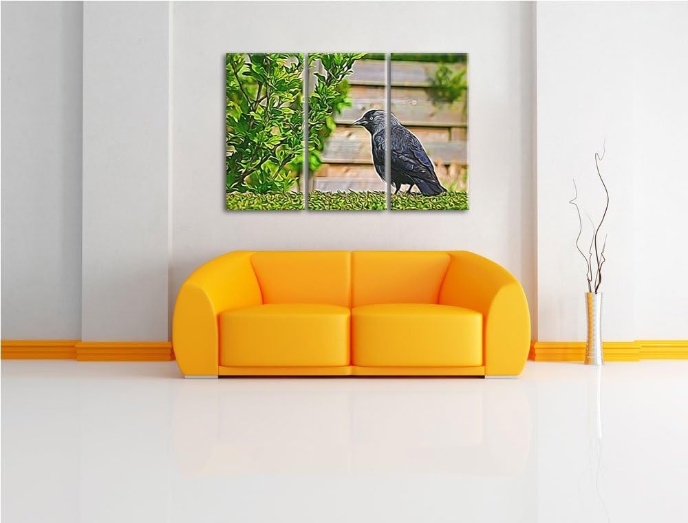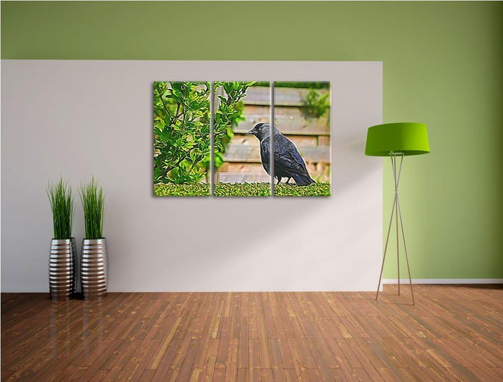 schöner schwarzer Vogel auf Gartenwiese NewArt 3-Teiler Leinwandbild 120x80 Bild auf Leinwand, XXL r