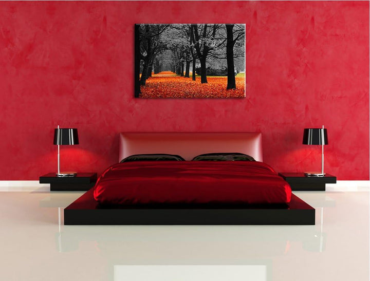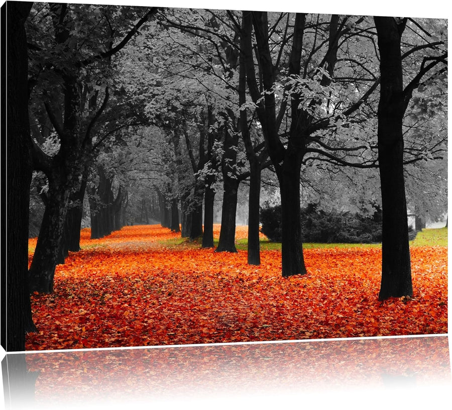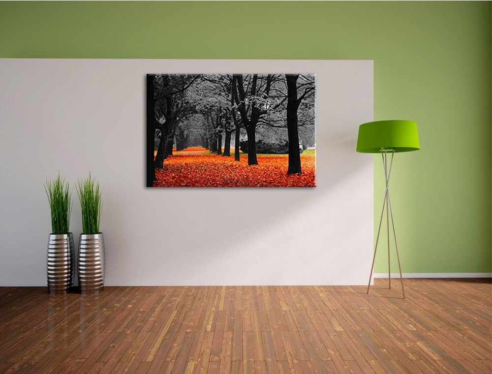 schöner Waldweg im Herbst schwarz/weiss Format: 100x70 auf Leinwand, XXL riesige Bilder fertig gerah