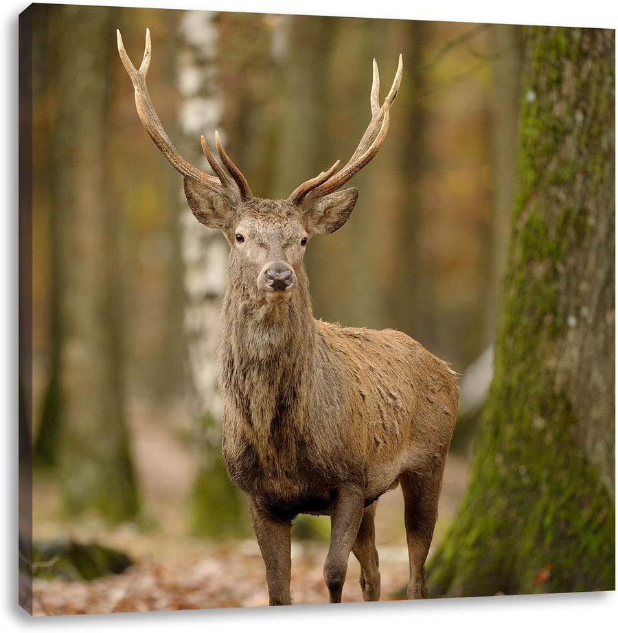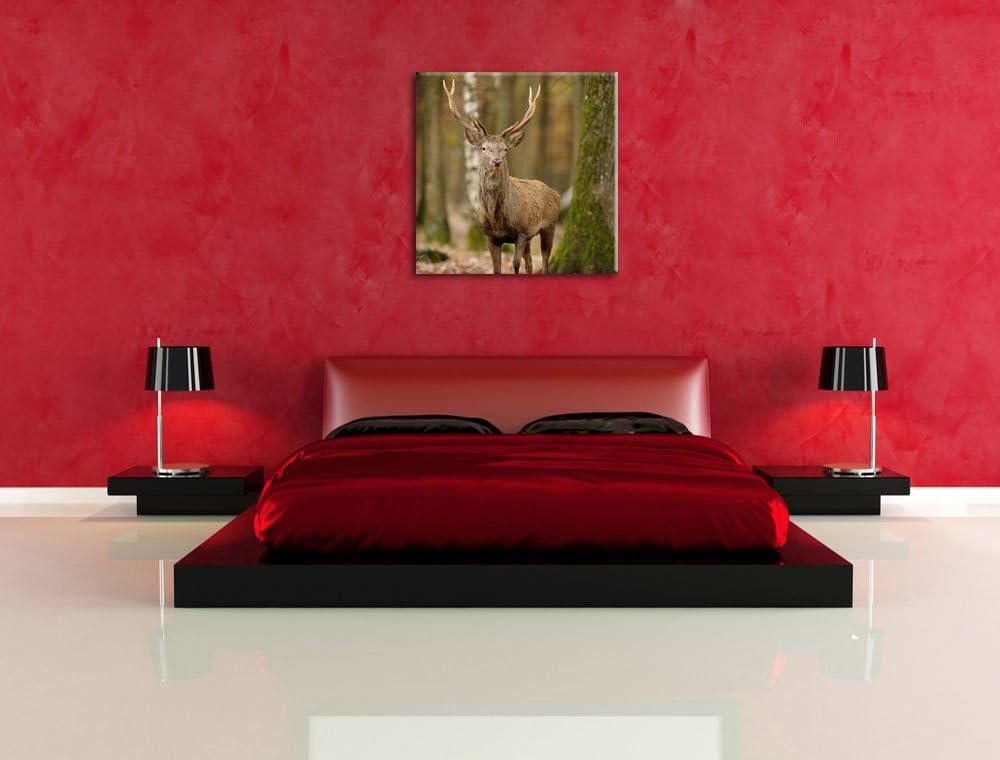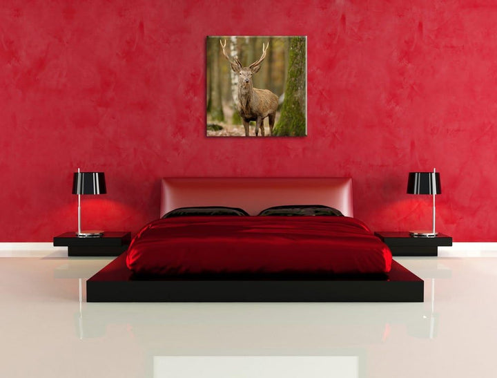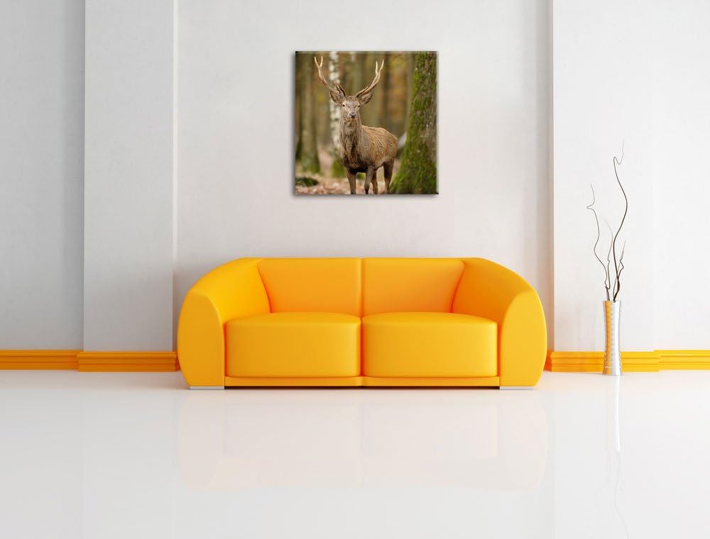 Schöner Hirsch im Wald, Format: 70x70 auf Leinwand, XXL riesige Bilder fertig gerahmt mit Keilrahmen