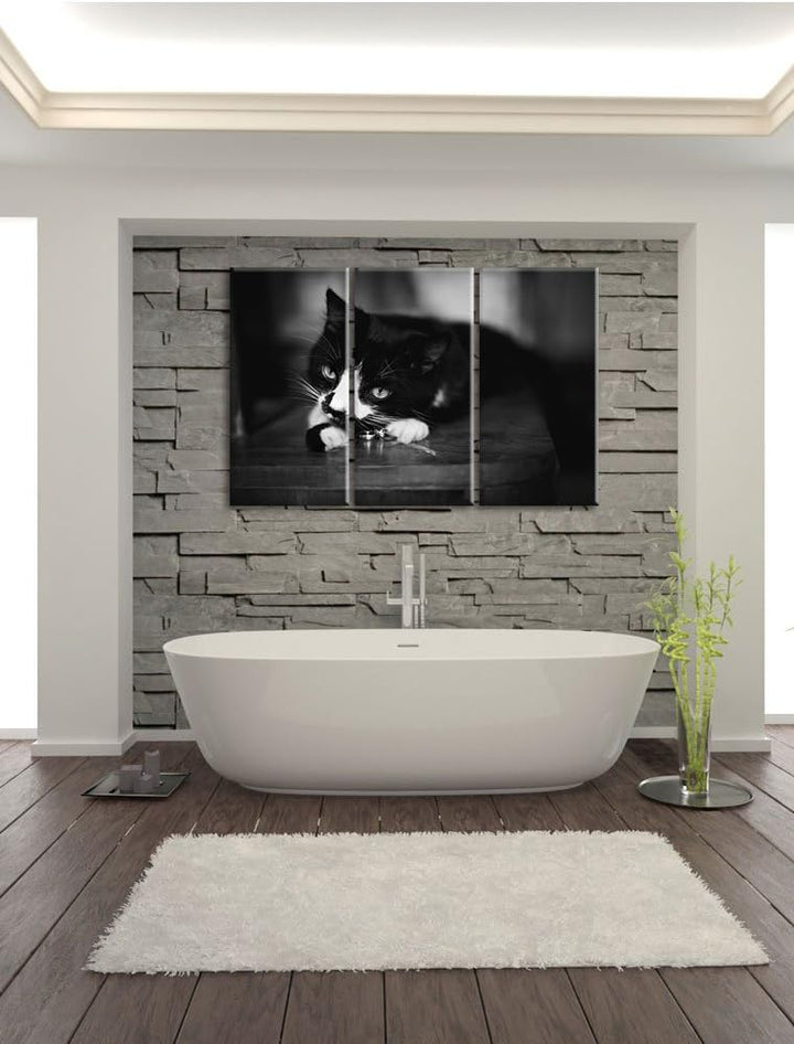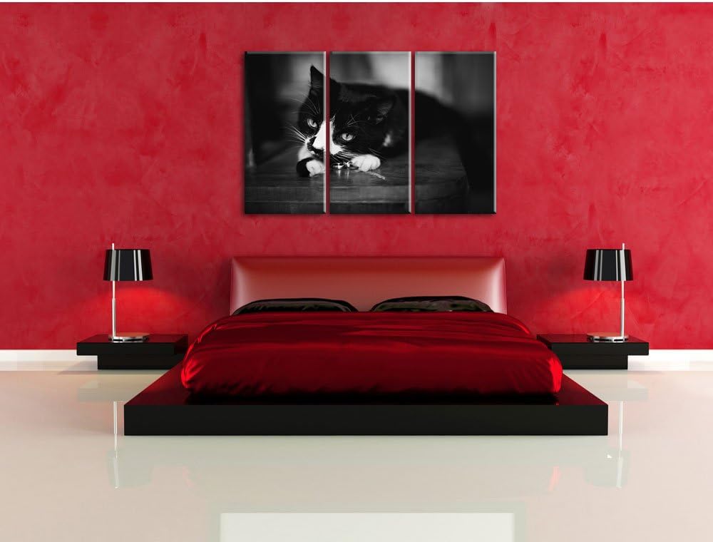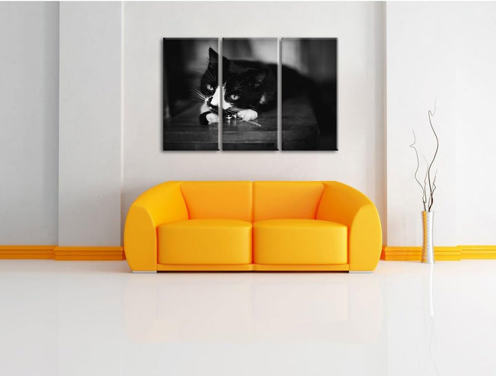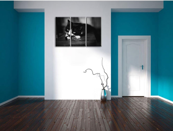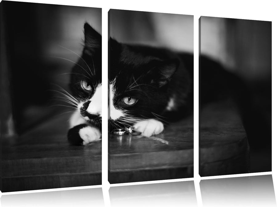 Schwarze Katze spielt mit Ehering B&W Detail 3-Teiler Leinwandbild 120x80 Bild auf Leinwand