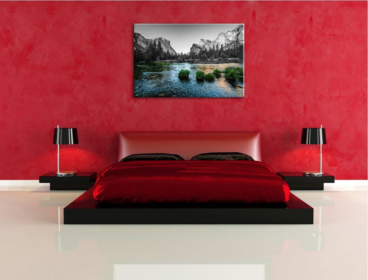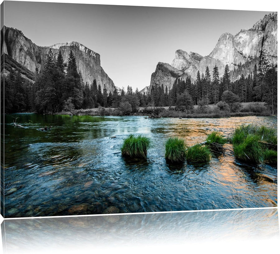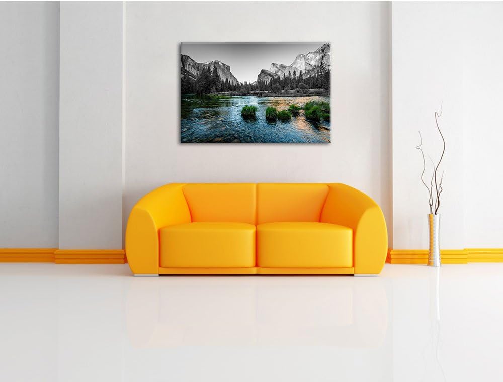 seichter Fluss vor Berglandschaft schwarz/weiss Format: 100x70 auf Leinwand, XXL riesige Bilder fert