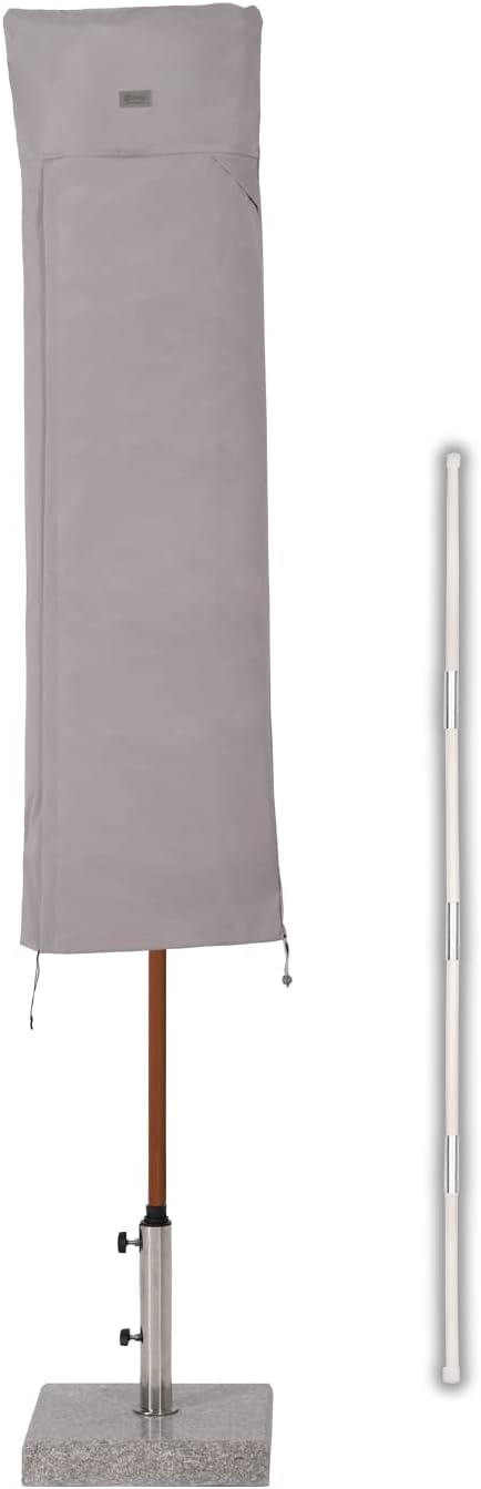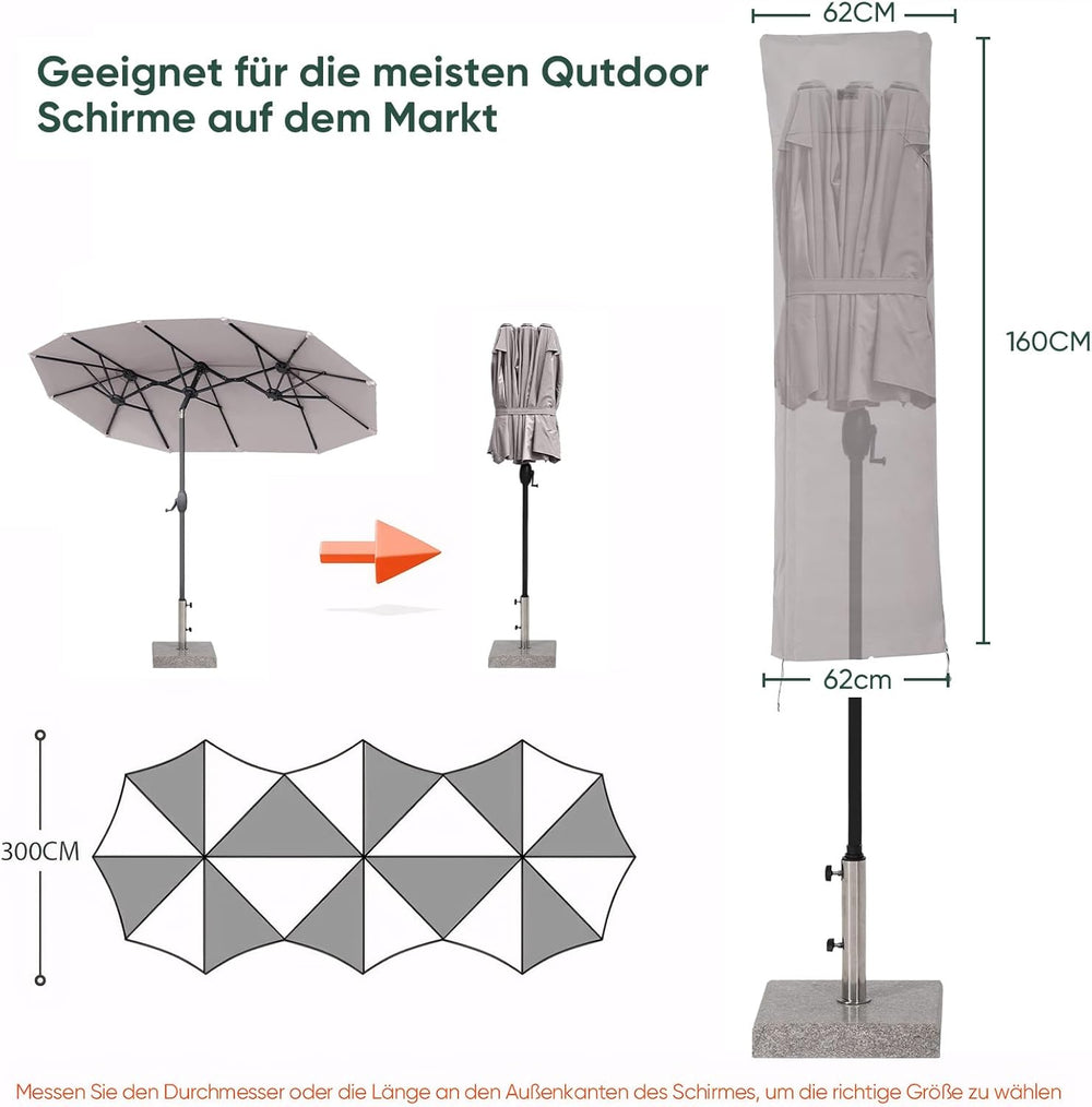 - Mit Stab und Reissverschluss, zum einfacheren Überziehen über den stehenden Schirm;
