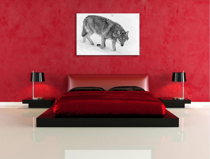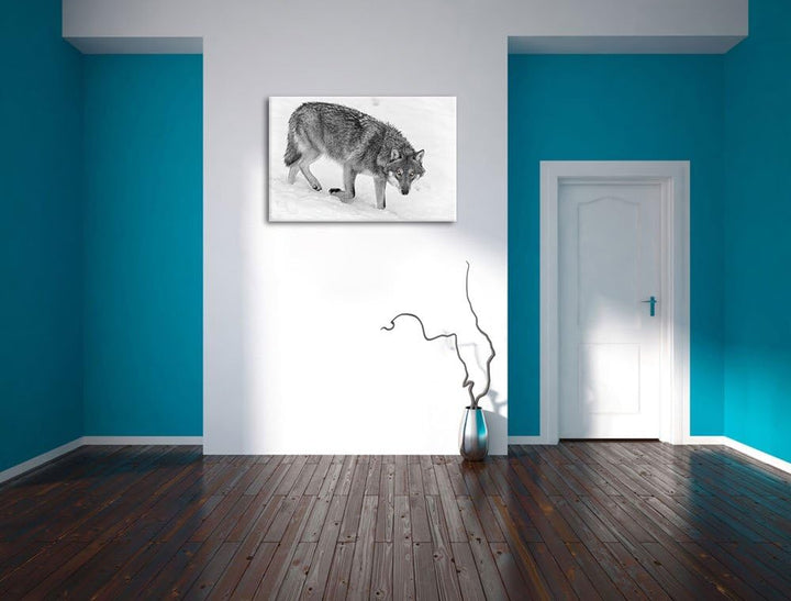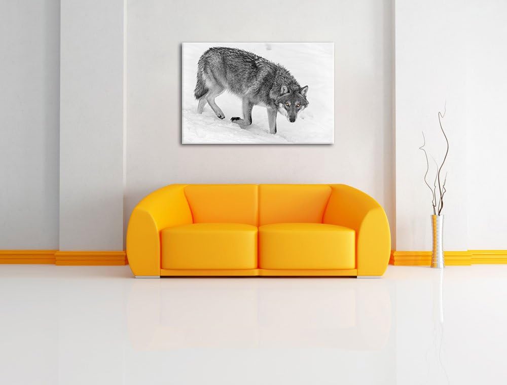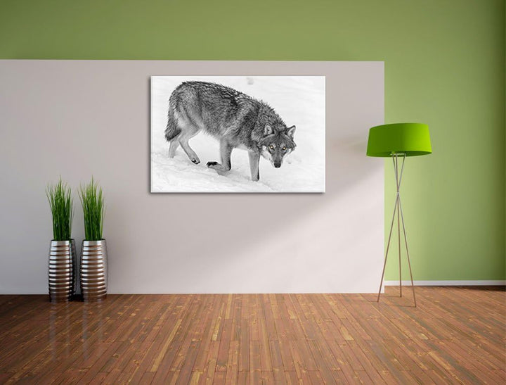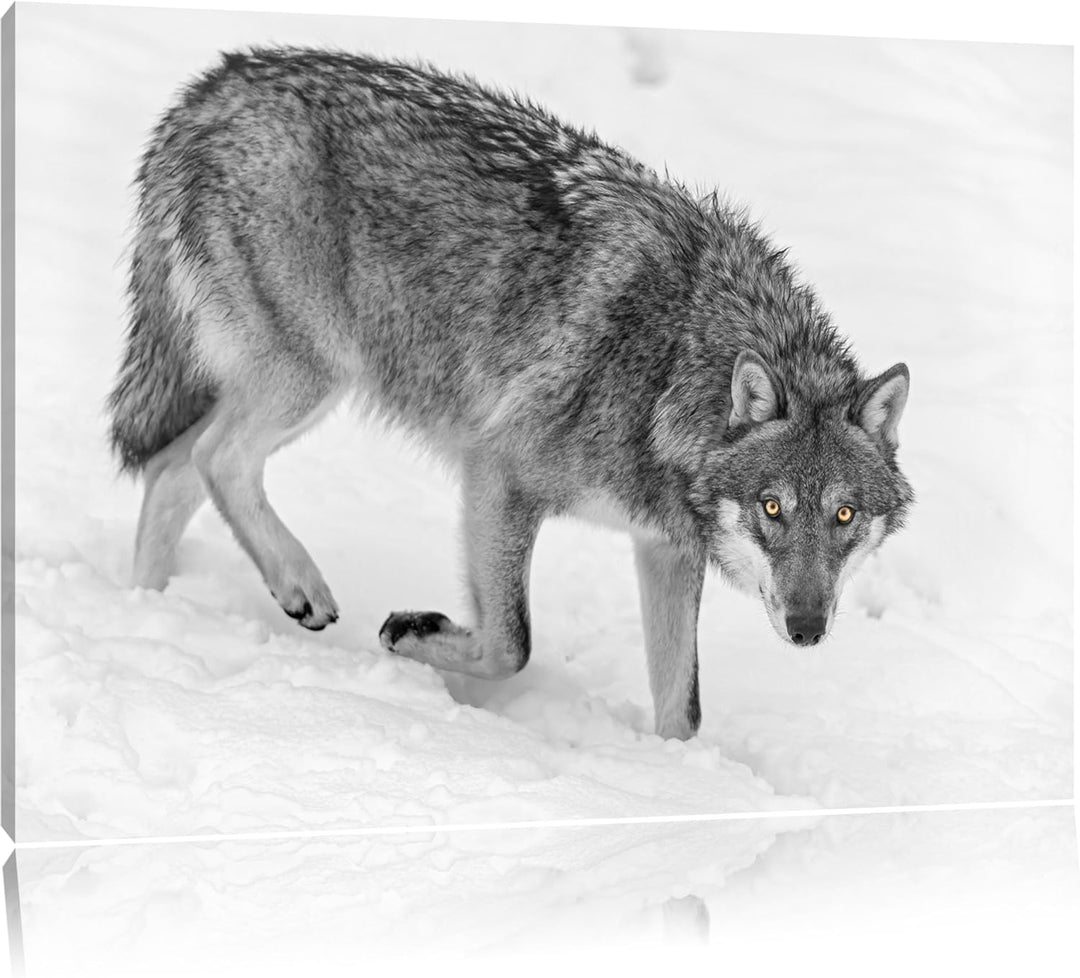seltener Wolf im Schnee schwarz/weiss auf Leinwand, XXL riesige Bilder fertig gerahmt mit Keilrahmen