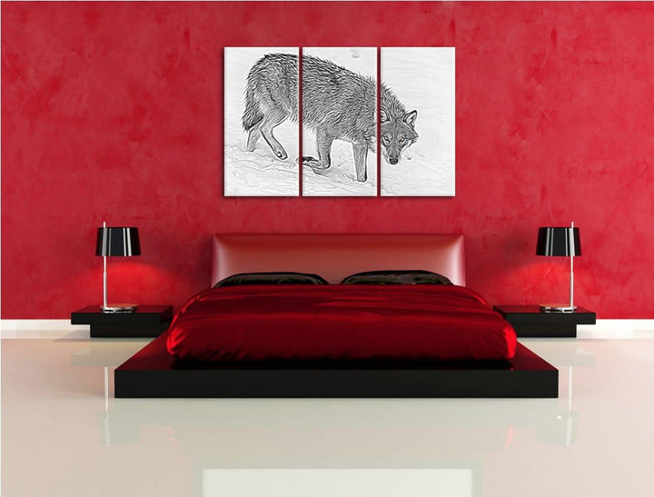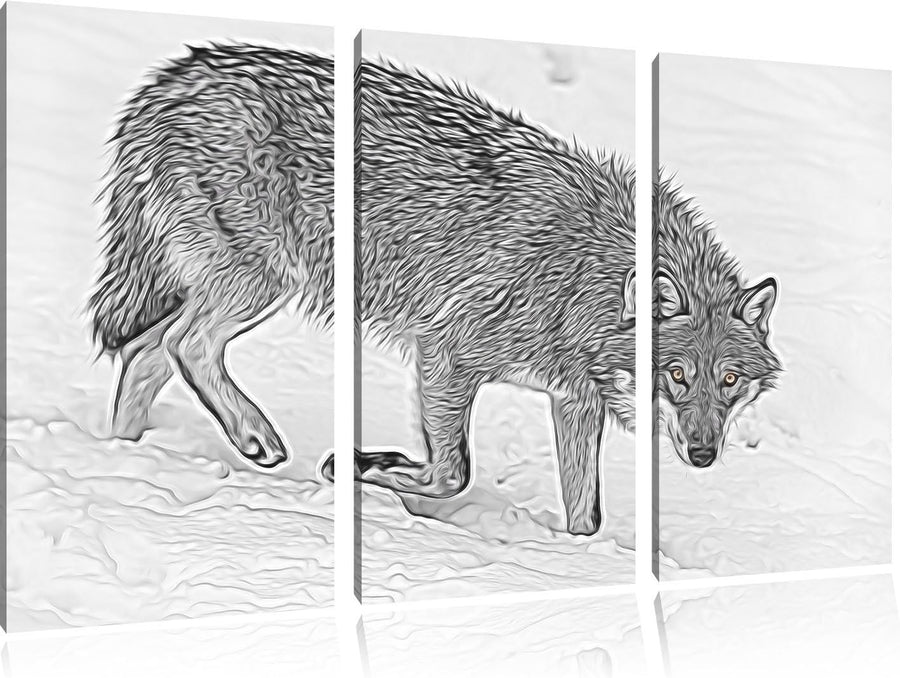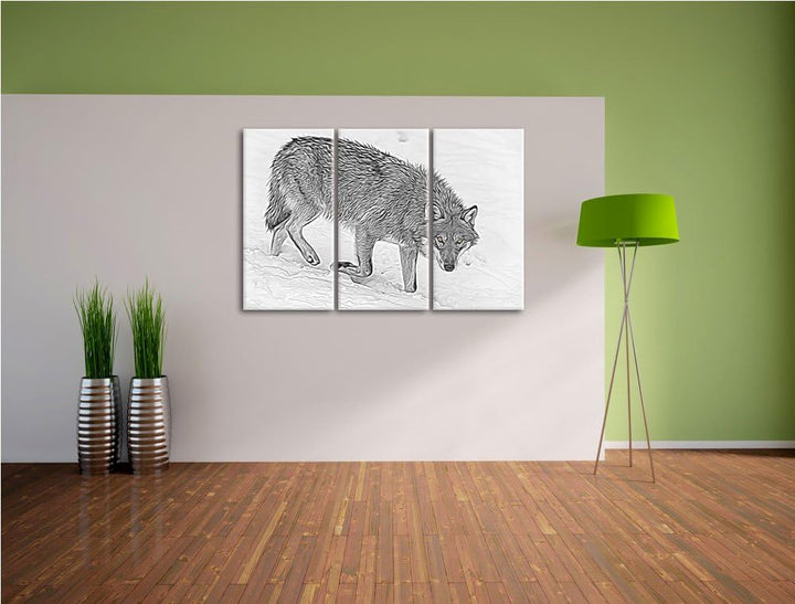 seltener Wolf im Schnee schwarz/weiss Deluxe 3-Teiler Leinwandbild 120x80 Bild auf Leinwand, XXL rie