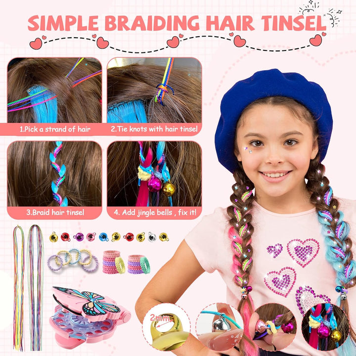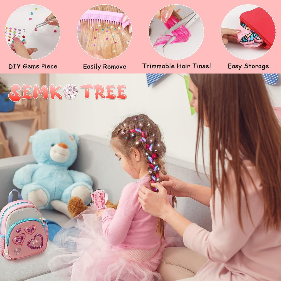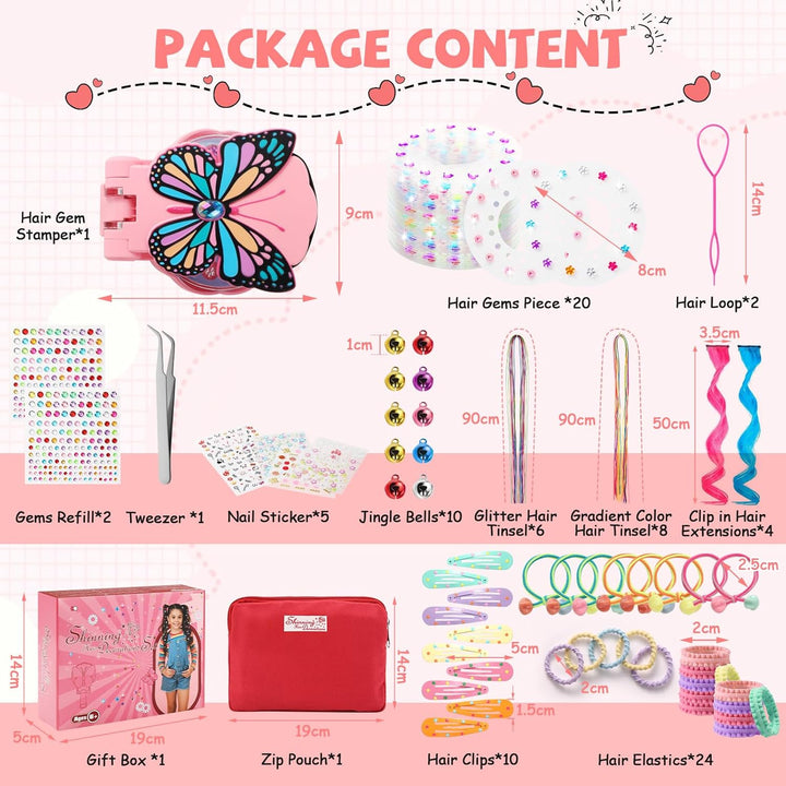 - ❀【Haare Glitzersteine Maschine】Enthält 1 hair gems stamper, 300 strasssteine haare, 330 glitzersteine selbstklebend, 4 haarsträhnen zum einklipsen, 6 glitzer hair tinsel, 8 bunte haarsträhnen kinder, 2 topsy tail, 10 haarspangen mädchen, 24
