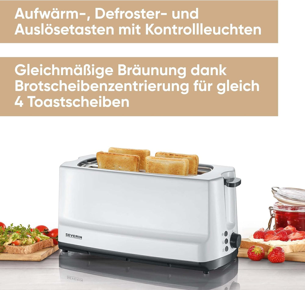 - Lieferumfang: 1 SEVERIN Toaster, AT 2234, Material: Kunststoff, Masse (LxBxH): 39 x 18,5 x 18 cm, Gewicht: 1,567 kg, Leistung: ca. 1400 W, Farbe: Weiss/Grau