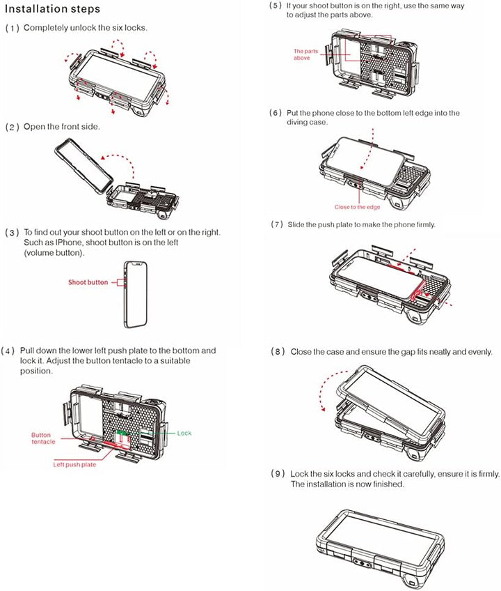 - Schnelleinrichtung: Setzen Sie Ihr Telefon ein und schliessen Sie den Koffer. Alles was Sie tun müssen, ist die Kamera oder das Video einzuschalten, bevor Sie unter Wasser sind. Das wasserdichte Gehäuse hat ein "Shutter" -Design. Um alle Details Ihres