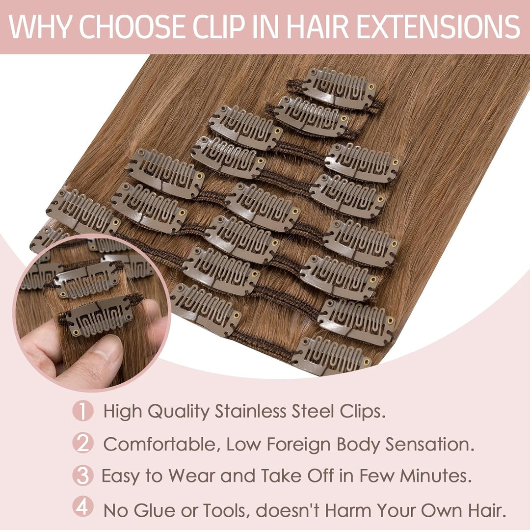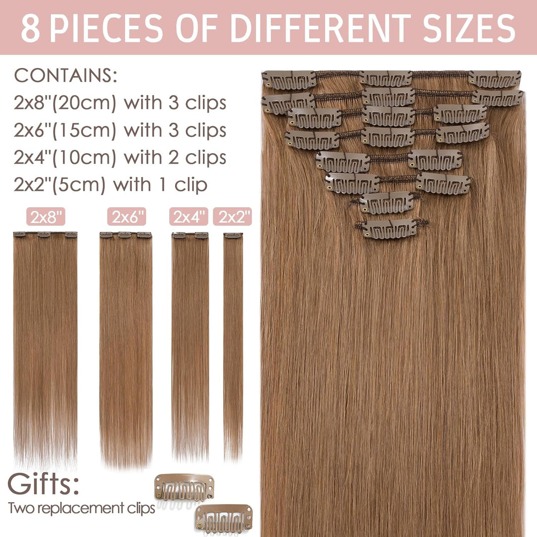- 【100% echtes haare, natürlicher und komfortabel】 clip in extensions sind aus hochwertigem brasilianischem remy echthaar, seidig glatt mit extra glanz und ohne verwicklungen. die dicke ist von kopf bis schwanz gleich. Dauerhafte extensions echthaar