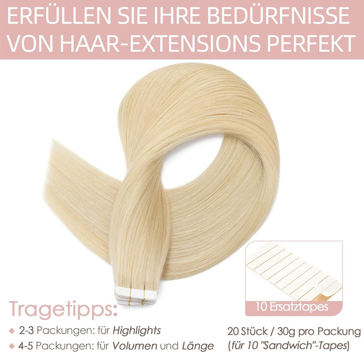 - Mühelose Installation mit Tape-Ins: Unsere Tape Extensions Echthaar werden mit hochfestem, unsichtbarem Klebeband hergestellt und lassen sich ganz einfach durch Abziehen und Aufkleben installieren - auch für Anfänger. Sie sparen Zeit und Geld beim