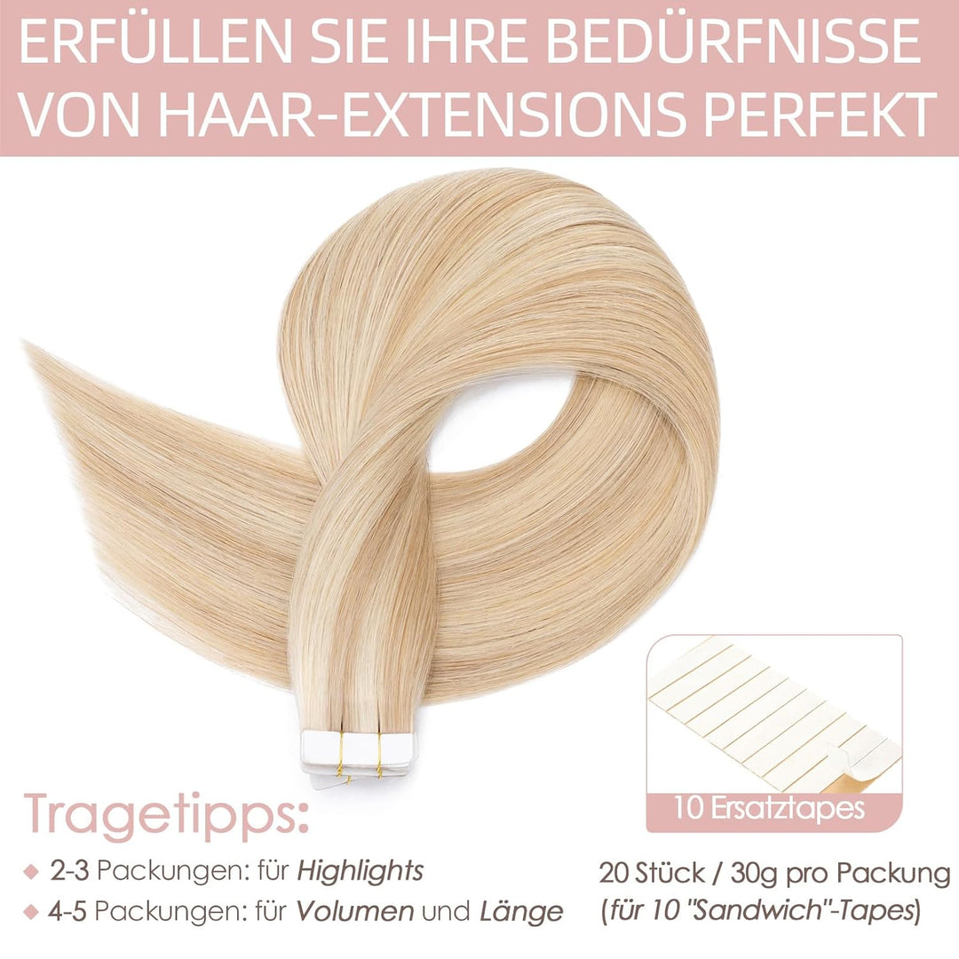 - Mühelose Installation mit Tape-Ins: Unsere Tape Extensions Echthaar werden mit hochfestem, unsichtbarem Klebeband hergestellt und lassen sich ganz einfach durch Abziehen und Aufkleben installieren - auch für Anfänger. Sie sparen Zeit und Geld beim