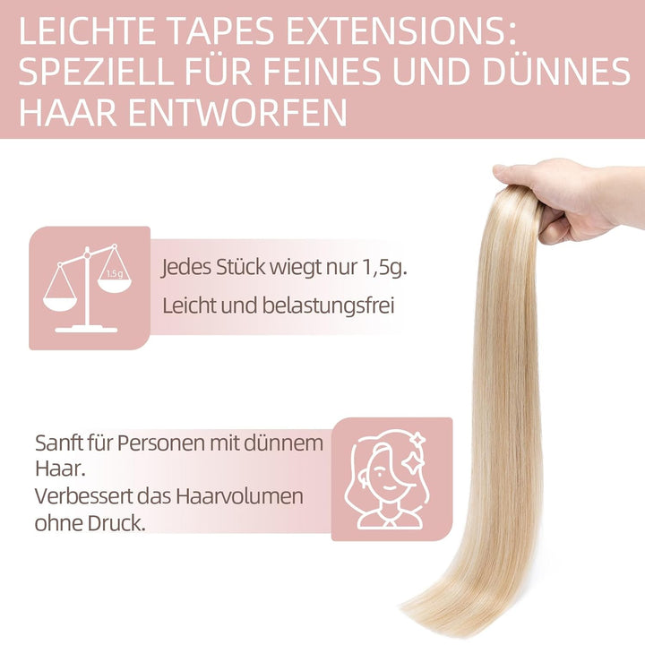 - Leichte und schonende Tape-Extensions: Unsere speziell für feines Haar entwickelten Haarverlängerungen wiegen nur 1,5g pro Extension (bei Längen unter 14 Zoll wiegt jede Extension 1g), um Haarschäden zu minimieren. Das geringere Gewicht reduziert das