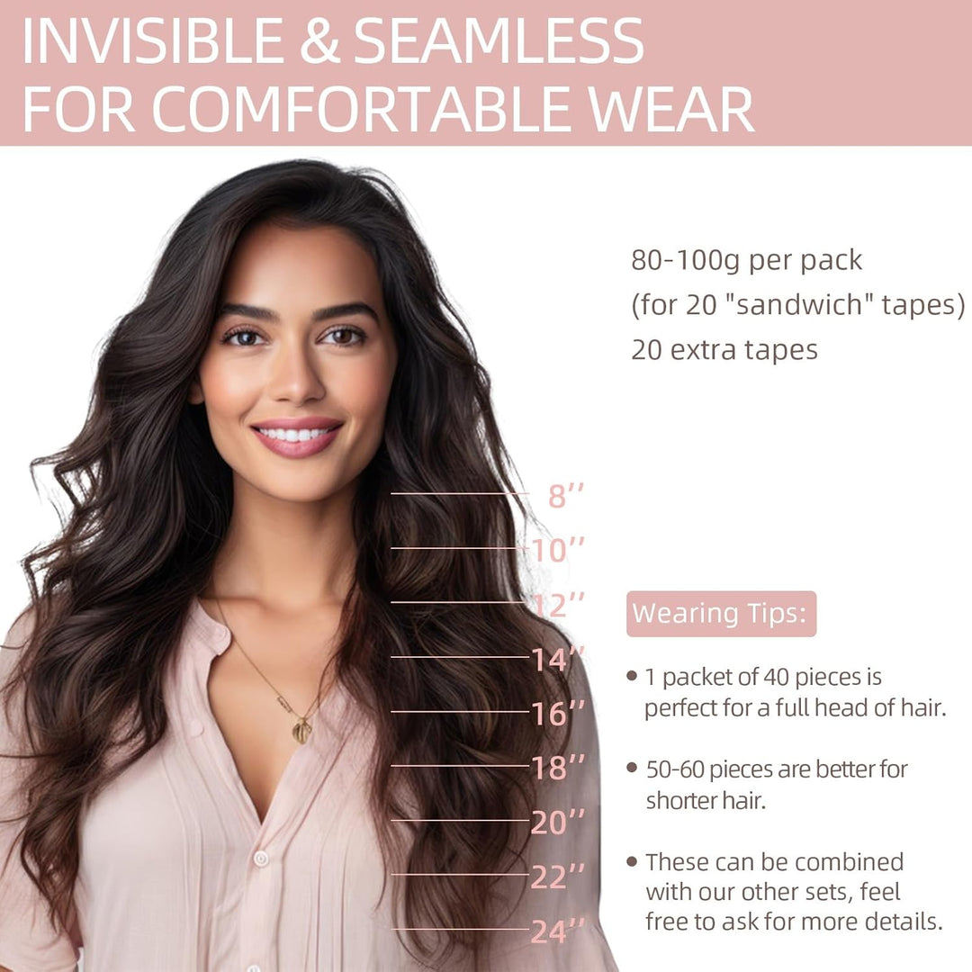 - ECHTES UND NATÜRLICHES HAAR FÜR ULTIMATIVEN KOMFORT: Unsere Tape in Echthaar Extensions bestehen aus hochwertigem brasilianischem Remy-Haar. Sie sind seidig glatt und verwickeln sich nicht. Die Haarstränge sind von der Wurzel bis zur Spitze gleich