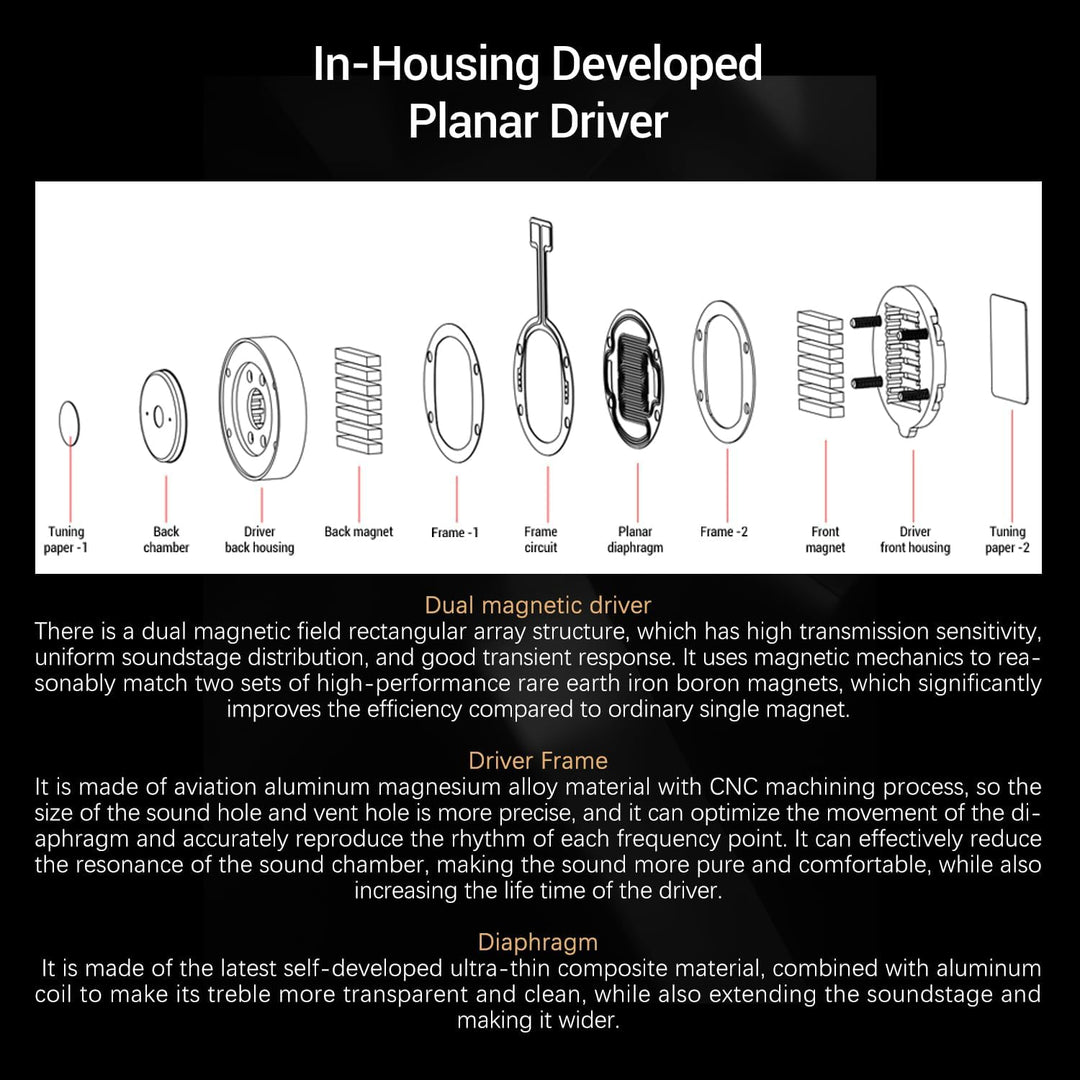 - DOPPELTER MAGNETTREIBER – Es gibt eine rechteckige Array-Struktur mit zwei Magnetfeldern, die eine hohe Übertragungsempfindlichkeit, eine gleichmässige Klangbühnenverteilung und ein gutes Einschwingverhalten aufweist. Es nutzt magnetische Mechanik,