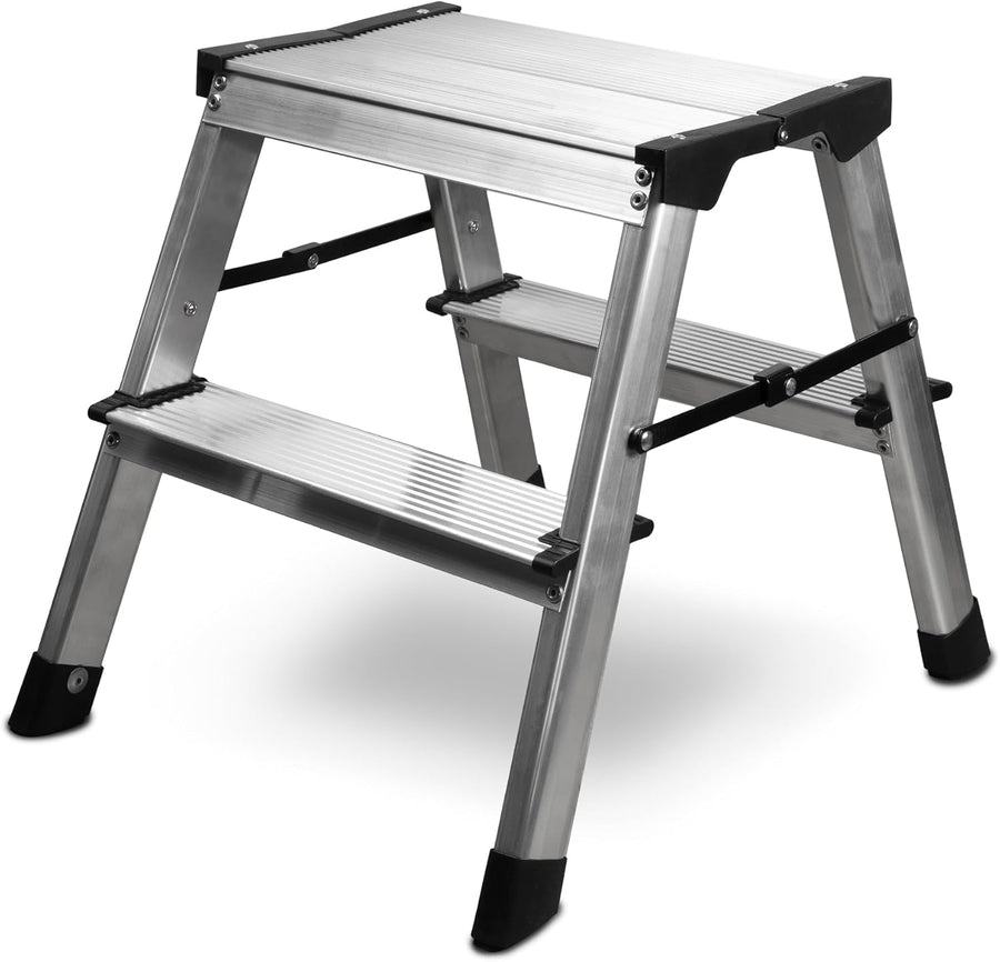 - PRODUKT DETAILS - Anzahl Stufen: 2 | Abmessungen (geöffnet): 37,5 x 47,3 x 38 cm | Abmessungen (zusammengeklappt): 37,5 x 19,6 x 44,8 cm | Gewicht: 1,75 kg | Stufenbreite: 20 cm | Material: Aluminium | Norm: DIN EN14183-B-2