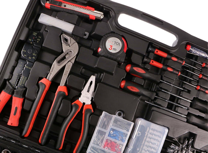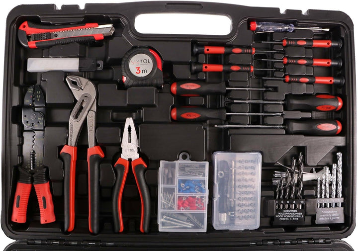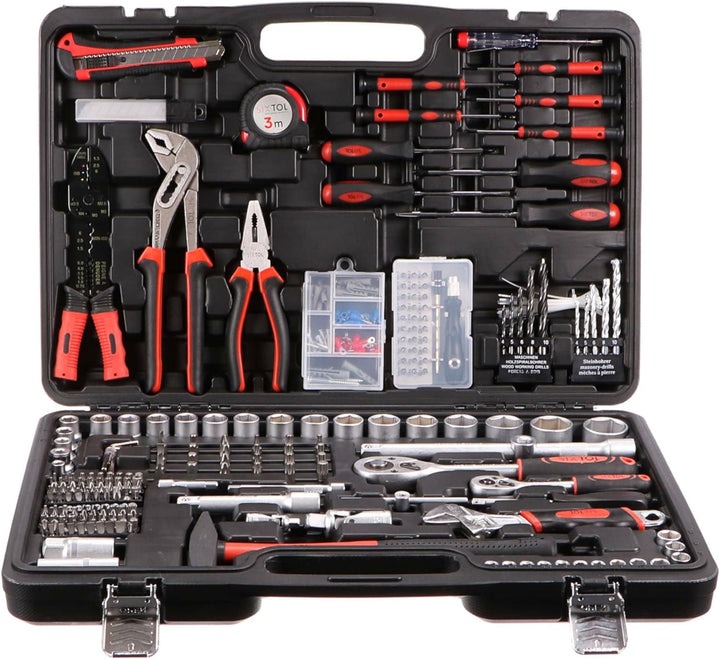 - Robuste Koffer mit Metallschnallen. Breite Palette an Universalwerkzeugen. Set enthält kleine und grosse Ratsche.