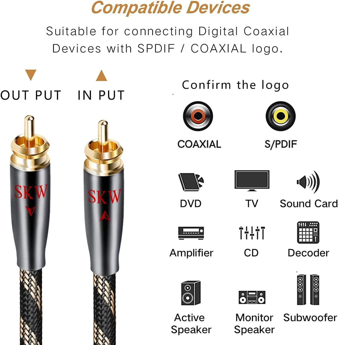 - Das SKW Digital Audio RCA Koaxialkabel - RCA Stecker auf Stecker ist in der Branche für seine innovativen und hochwertigen Produkte bekannt. Die Leiter sind doppelt geschirmt, hochwertige polierte Metallsteckergehäuse und korrosionsbeständige