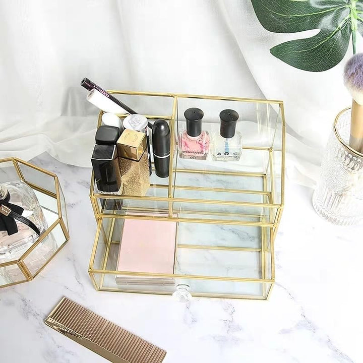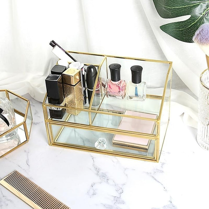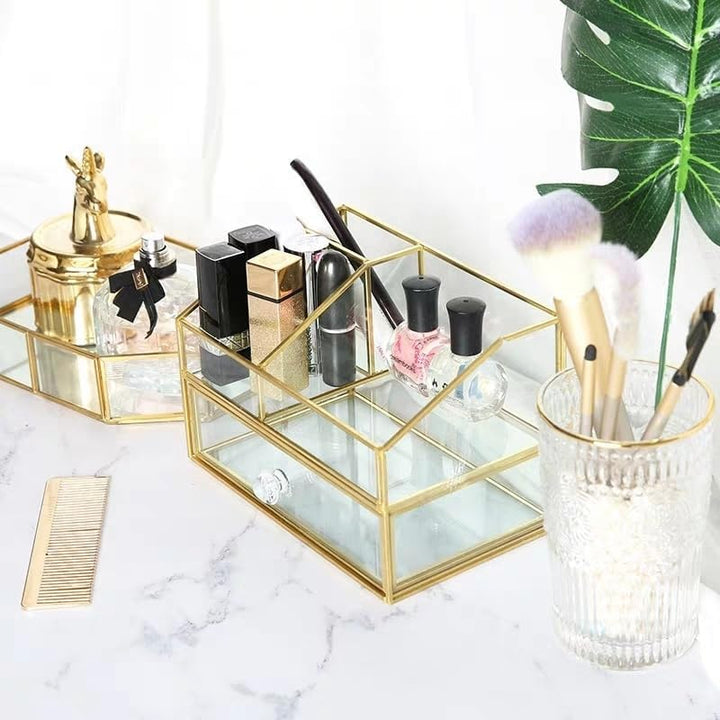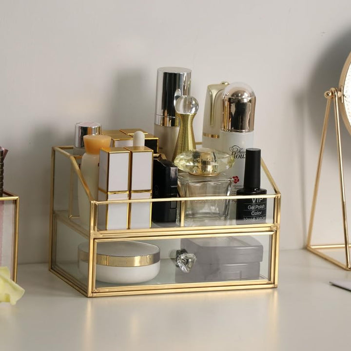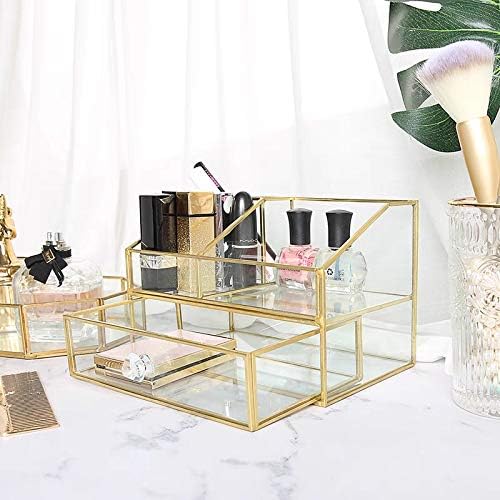 - 【Design & Materialien】 - Makeup Organizer Gut gemacht mit Premium-Gold-Messing-Trim und glattem Glas. High-End-Textur-Stil ist, um Ihre Kommode Lebensqualität und grosse Helfer für Desktop-Organisation hinzuzufügen.