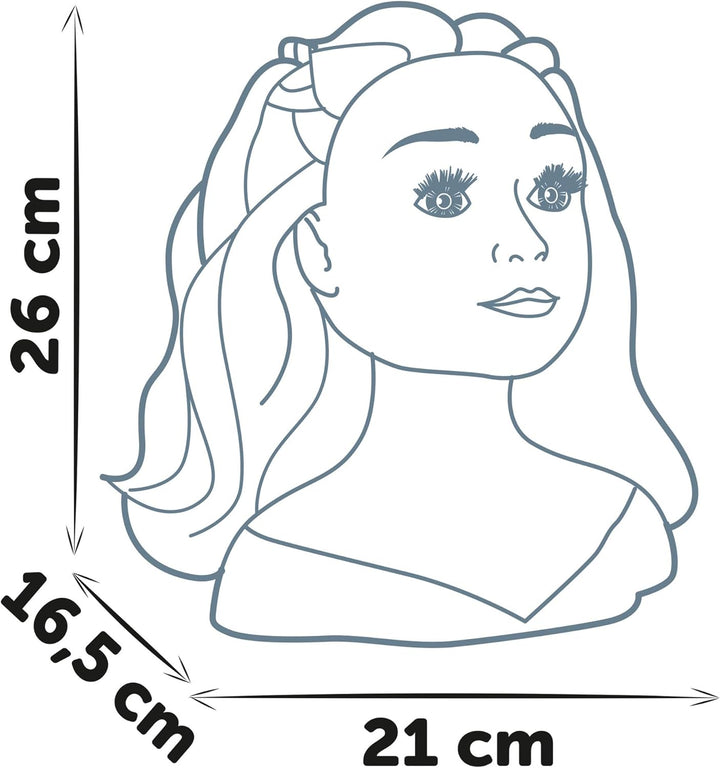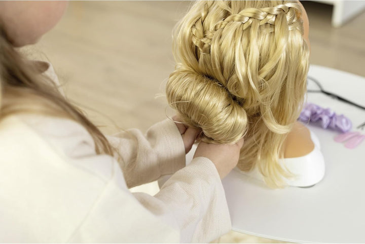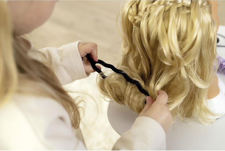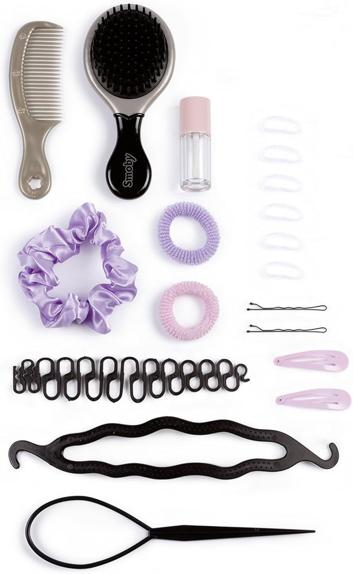 - Zusammensetzung des Sets: Frisierkopf, Bürste, Kamm, Haarspangen, Haargummis, Flechtzubehör.