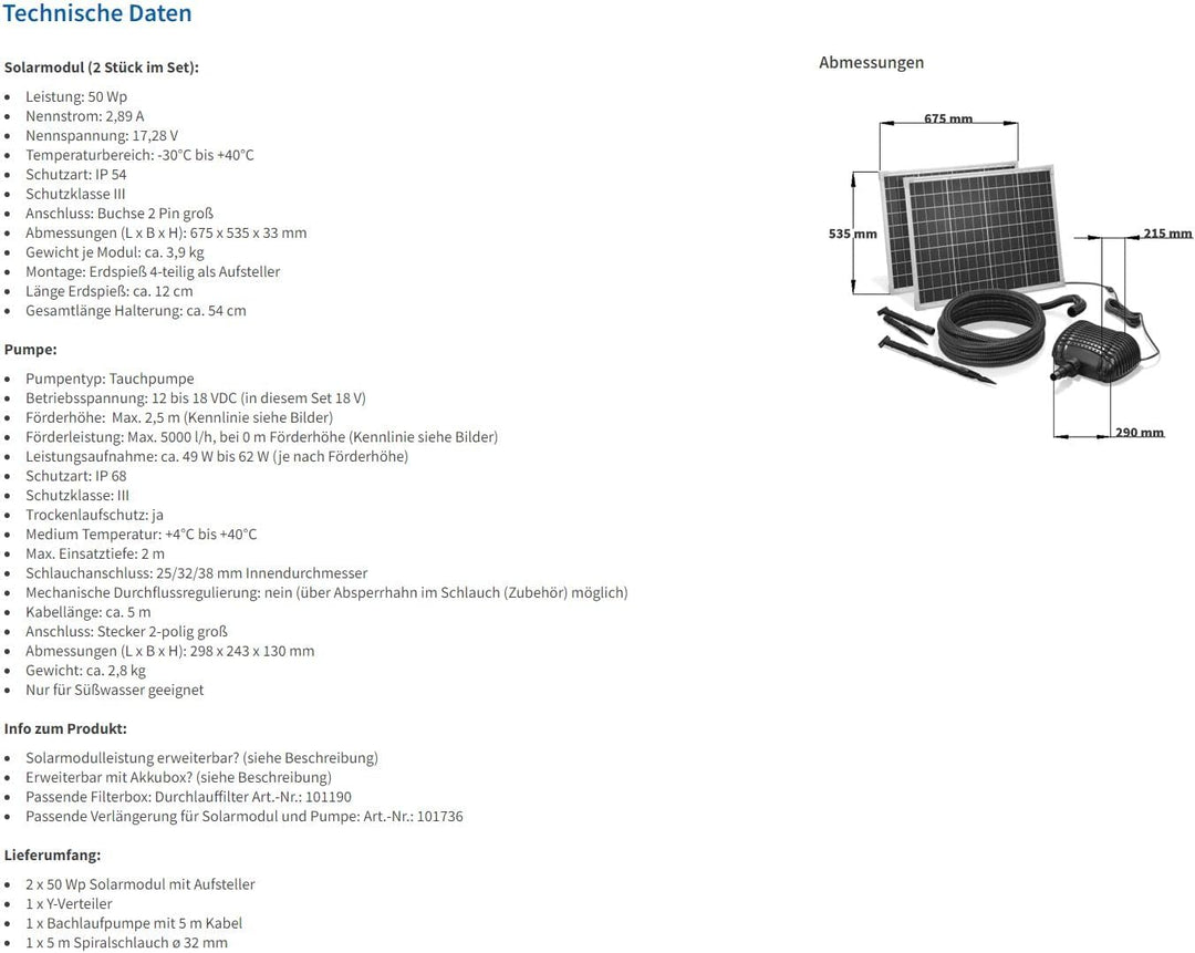 - Pumpe arbeitet im Direktbetrieb! Je nachdem wieviel Sonne auf das Modul scheint pumpt die Pumpe Wasser. Leistungsdiagramm bei den Bildern enthalten!