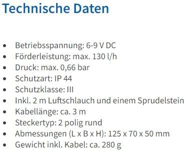 - Betriebsspannung: 6-9 V DC, Förderleistung: max. 130 l/h