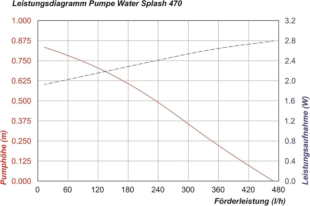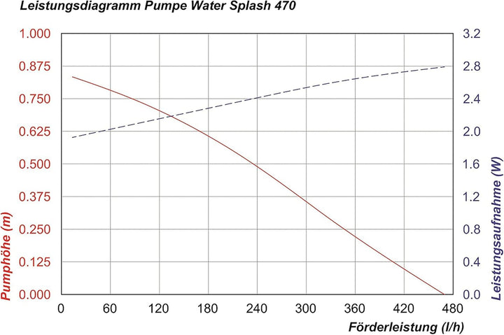 - Max. Förderleistung bei 12V DC 470 l/h, Förderhöhe max. 0,75 m