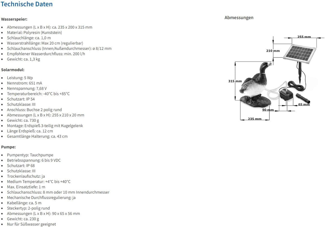 - Solarpumpe - Betriebsspannung: 6-9V DC - Förderleistung: max. 250 l/h, regulierbar - Schlauchanschluss (ø 8,5 oder 10,5 mm) - Solarmodul Leistung: 5 Wp (Watt Peak) - Solarmodul Abmessungen (L x B x H): 255 x 210 x 17 mm