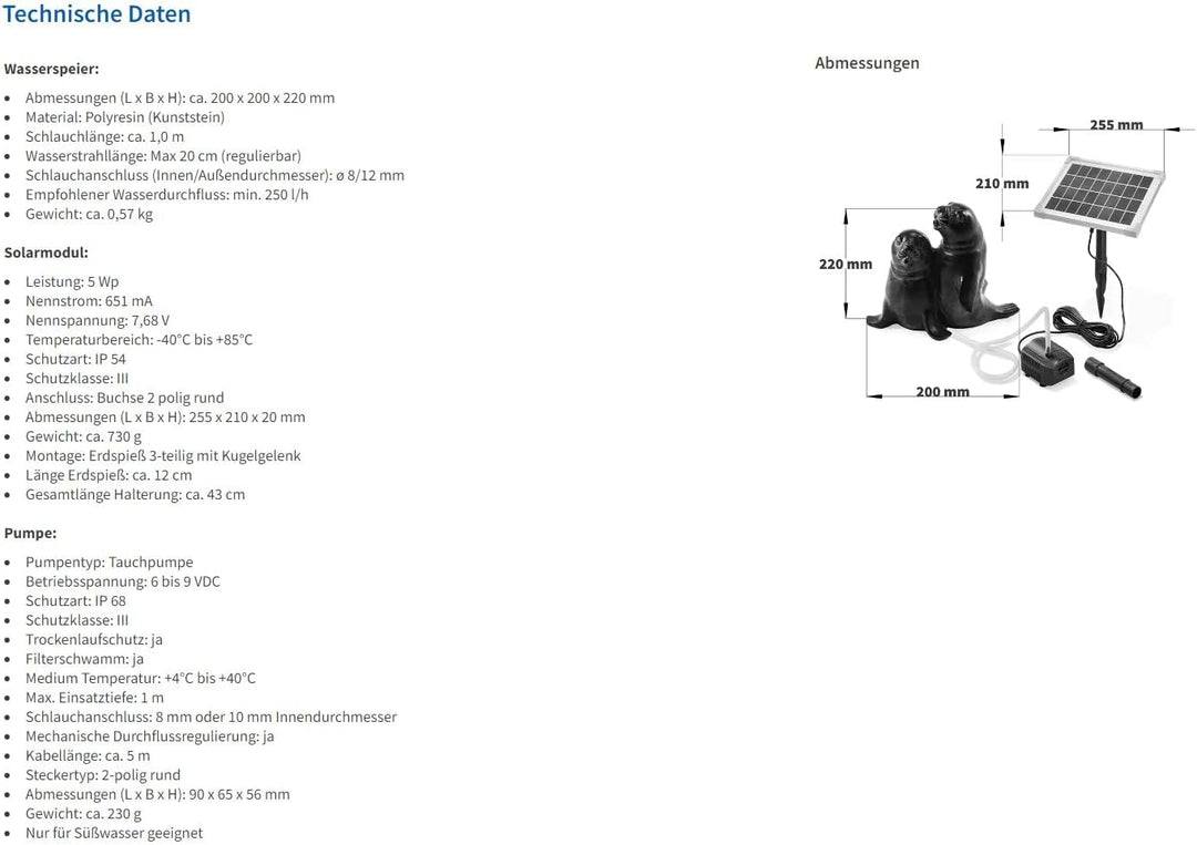 • Solarpumpe - Betriebsspannung: 6-9V DC - Förderleistung: max. 250 l/h, regulierbar - Schlauchanschluss (ø 8,5 oder 10,5 mm) - Solarmodul Leistung: 5 Wp (Watt Peak) - Solarmodul Abmessungen (L x B x H): 255 x 210 x 17 mm