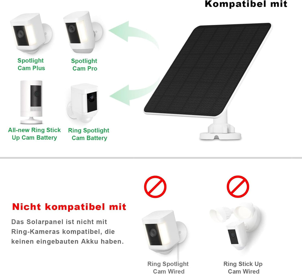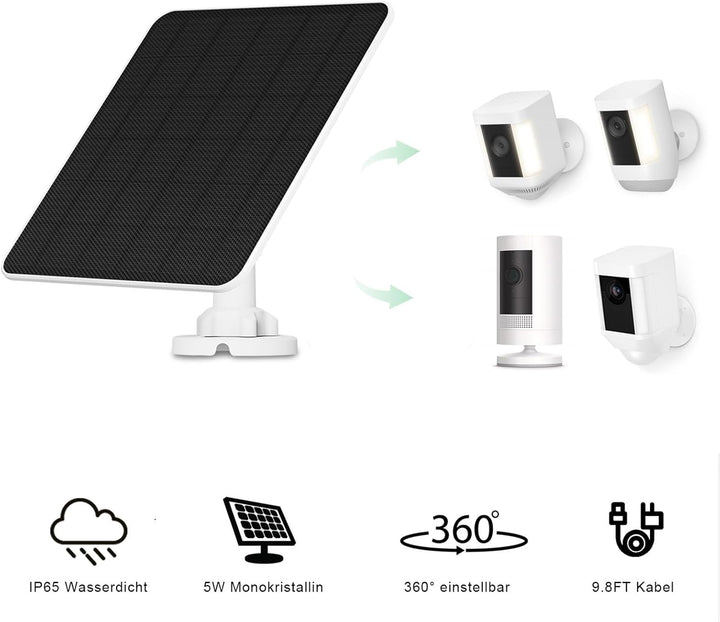 - Kompatibilität: Das solarpanel für ring-kamera ist kompatibel mit Ring Stick Up Cam Akku und Spotlight Cam Akku. Der Barrel-Stecker-zu-USB-C-Adapter ist im Paket enthalten und das Solarpanel ist auch mit Spotlight Cam Plus (USB-C-Anschluss) und