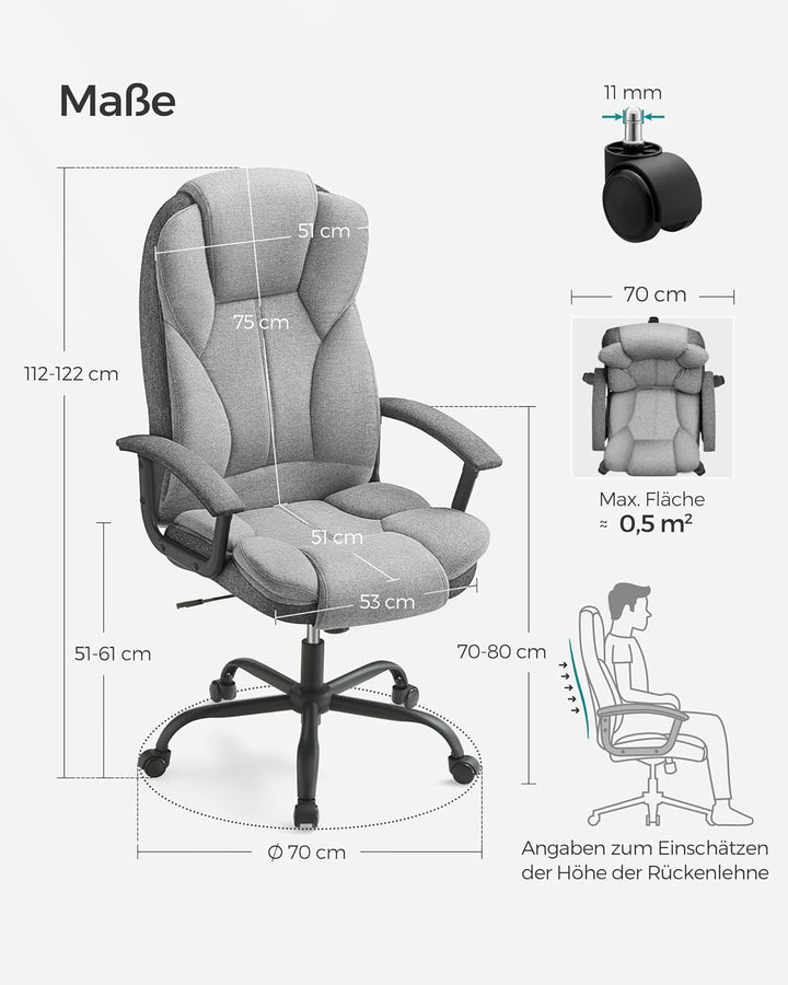 - [An mehreren Stellen verstellbar] Die Sitzhöhe ist zwischen 51 und 61 cm einstellbar; die verstellbare Kopfstütze bietet optimalen Halt für Nacken und Kopf, geeignet für Benutzer mit einer Körpergrösse von 170-190 cm; 95-110° Kippfunktion zur