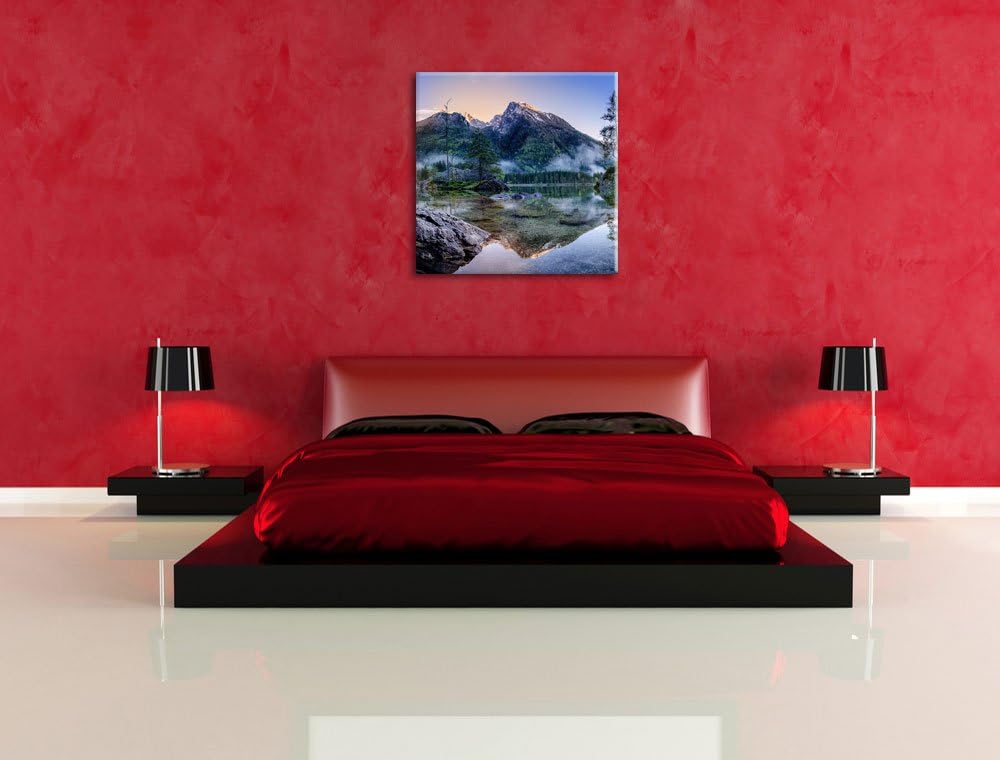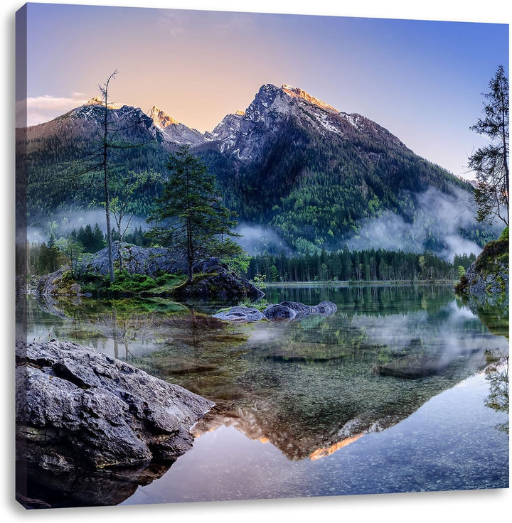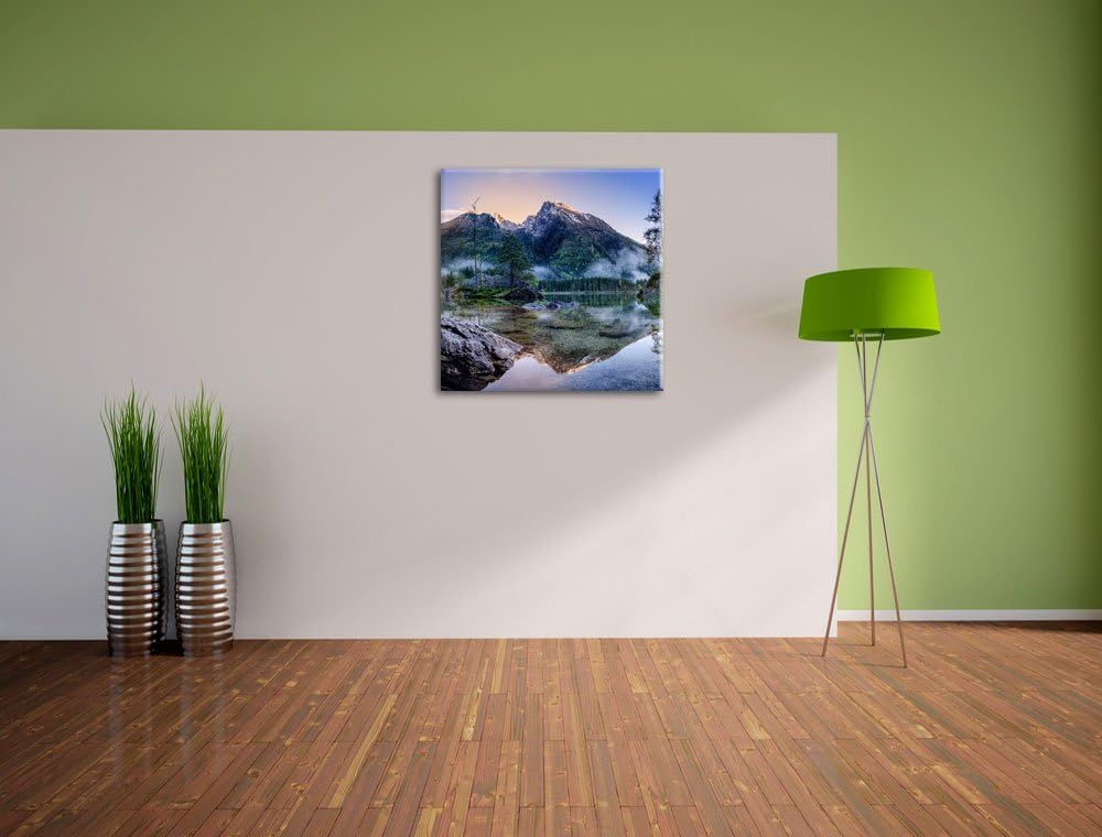 Sonnenaufgang am Hintersee, Format: 70x70 auf Leinwand, XXL riesige Bilder fertig gerahmt mit Keilra