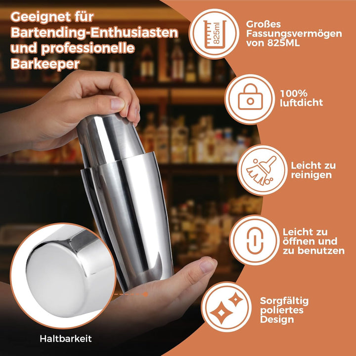 - Boston Shaker Set: Das boston shaker set mit einem Fassungsvermögen von 825 ml ist ein seltenes und einzigartiges Design auf dem Markt, das durch seine unverwechselbare Qualität und exquisite Handwerkskunst besticht. Die herausragende