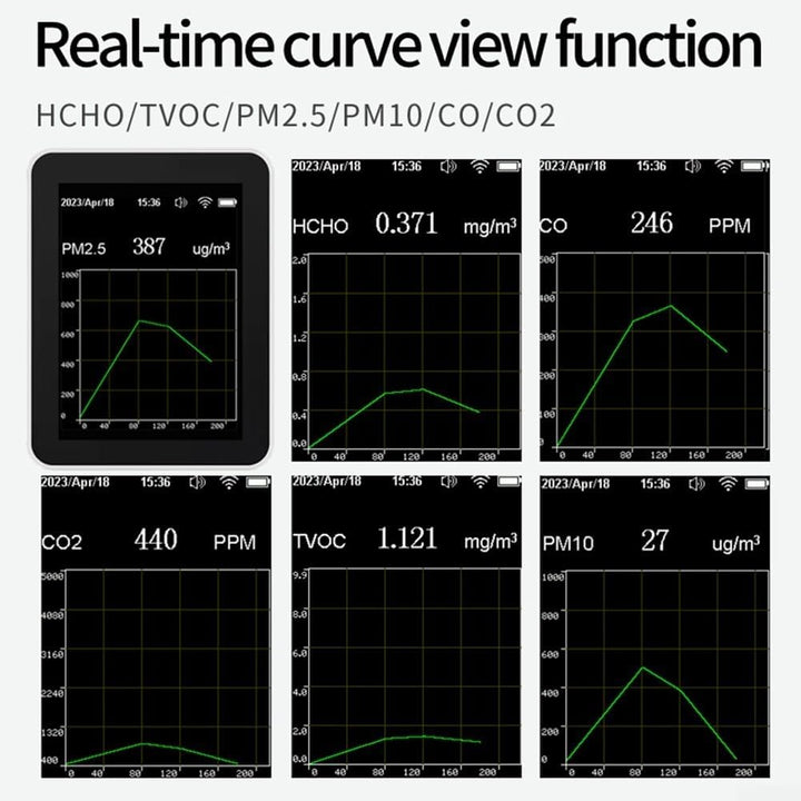 - 【10-in-1-Luftqualitätserkennung】 Erkennt und zeigt gleichzeitig Konzentrationen von PM5, PM10, HCHO, AQI, Temperatur und Luftfeuchtigkeit an.