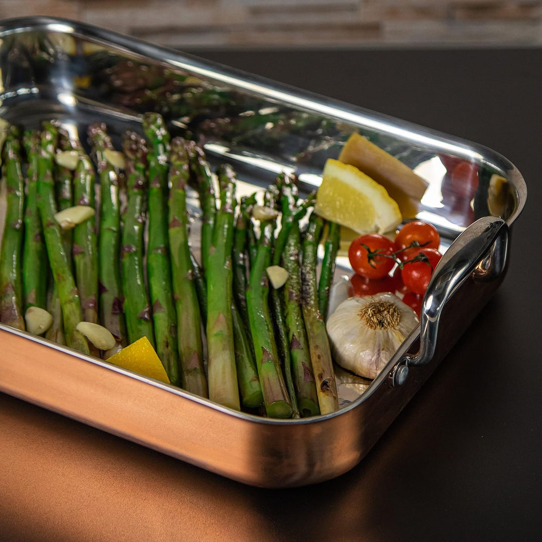 - OPTIMALE WÄRMEVERTEILUNG: Mithilfe des 5-Lagen-Mehrschichtmaterials, mit einer Aussenschicht aus reinem Kupfer und einer innenliegenden 18/10 Edelstahlschicht mit dreifachem Aluminiumkern.