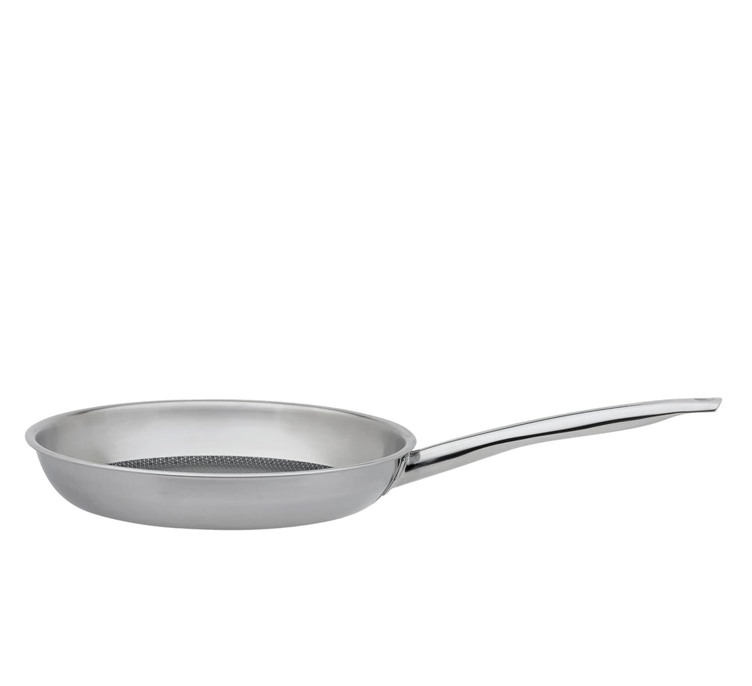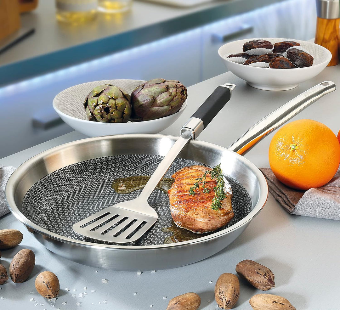 • KRATZFEST: Die Edelstahlpfanne von Spring verfügt über eine Wabenbeschichtung, die jedem Pfannenwender strotzt. Selbst Metall hinterlässt in dieser Pfanne keinen Kratzer.