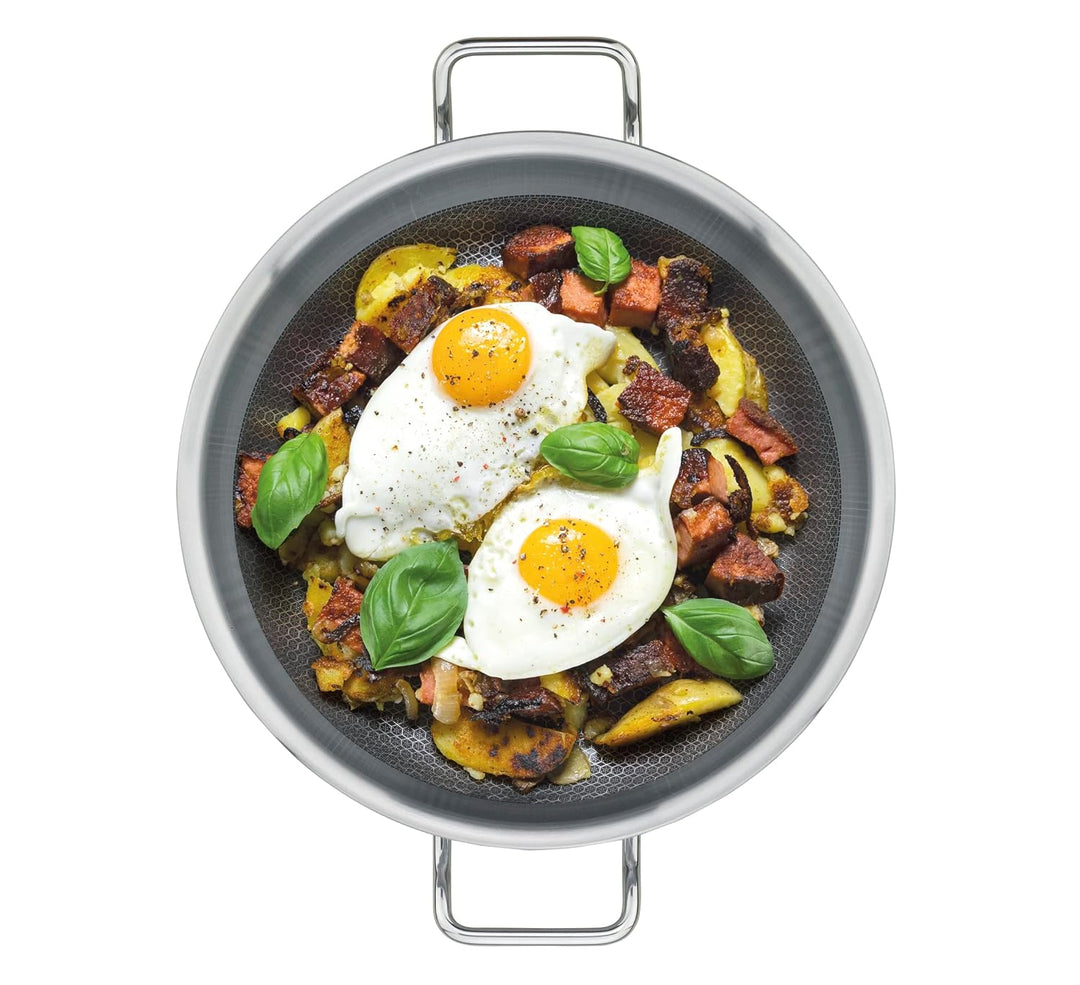- KRATZFEST: Die Edelstahlpfanne von Spring verfügt über eine Wabenbeschichtung, die jedem Pfannenwender strotzt. Selbst Metall hinterlässt in dieser Pfanne keinen Kratzer.