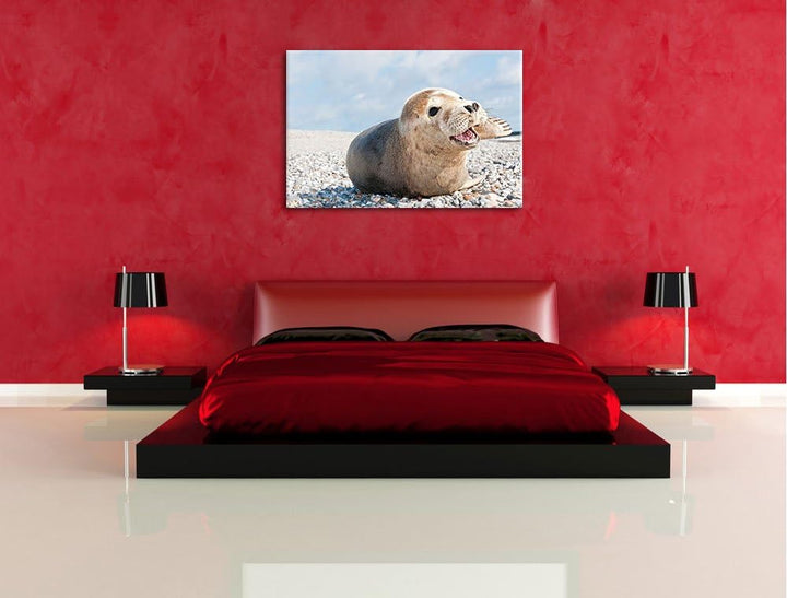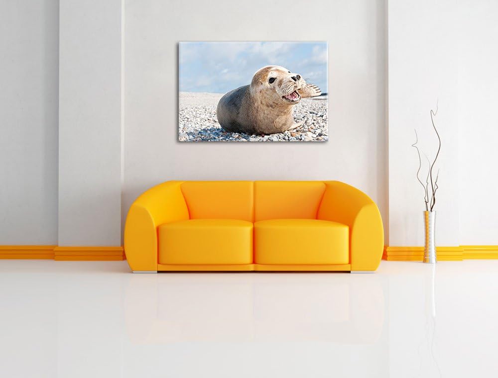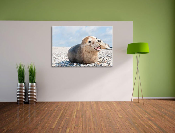 Süsse Robbe auf Steinstrand Format: 100x70 auf Leinwand, XXL riesige Bilder fertig gerahmt mit Keilr