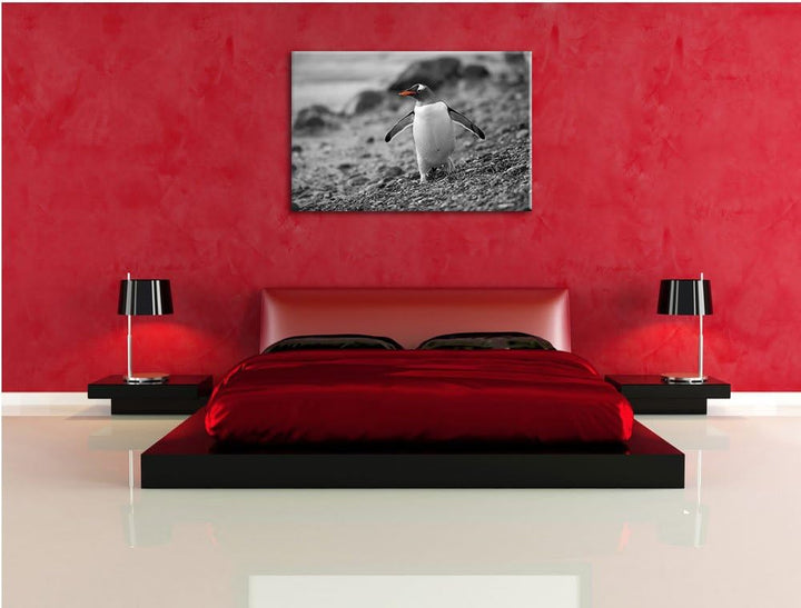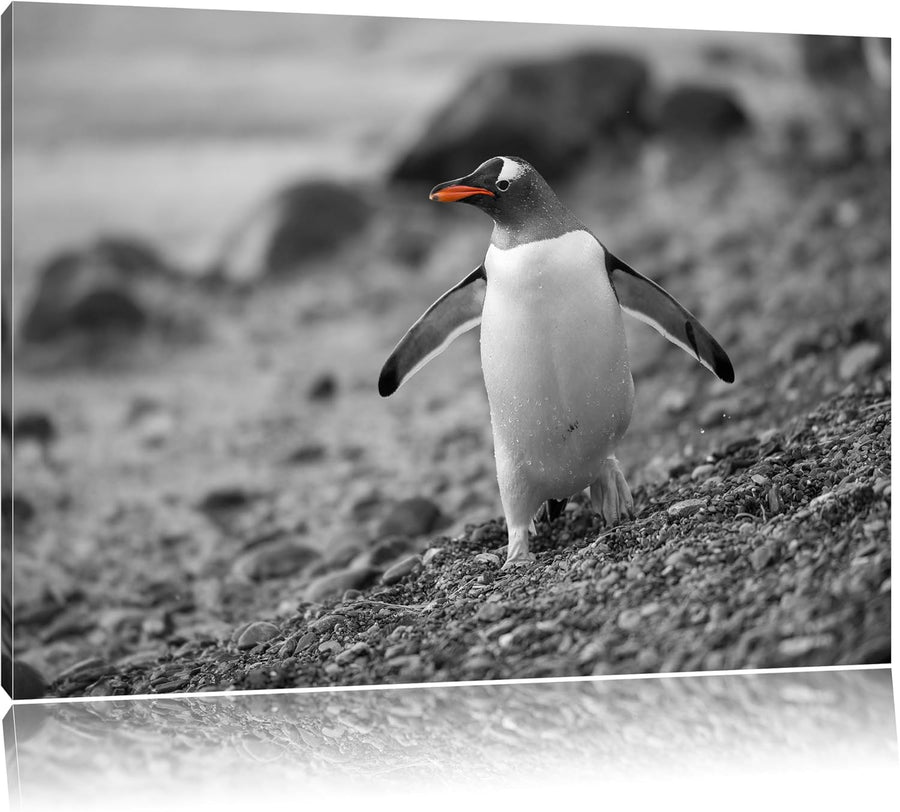 süsser Pinguin am Steinstrand schwarz/weiss Format: 100x70 auf Leinwand, XXL riesige Bilder fertig g