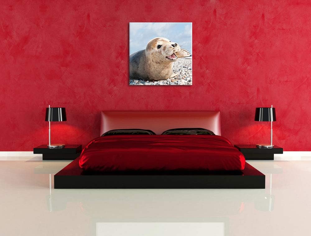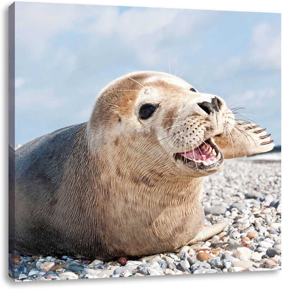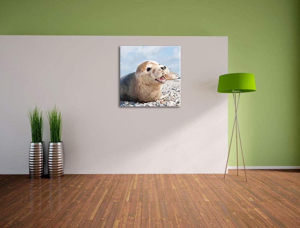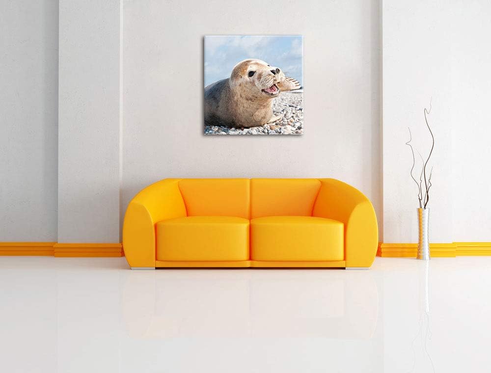 Süsse Robbe auf Steinstrand, Format: 70x70 auf Leinwand, XXL riesige Bilder fertig gerahmt mit Keilr